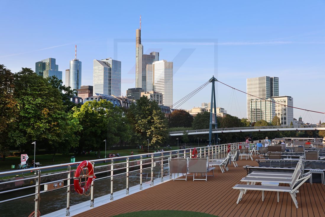 Nach dem Aufenthalt in Wiesbaden verlässt Lady Diletta den Rhein bei Mainz-Kostheim und biegt in den Main ab. Mit einer Länge von 527 Kilometern ist der Main der längste, rechte Nebenfluss des Rheins. Schiffbar ist er auf einer Länge von 388 Kilometer ab Bamberg. Wir werden den Main auf dieser gesamten Länge in den nächsten Tagen befahren. Insgesamt müssen 27 Schleusen passiert werden. Am Nachmittag zieht an der Steuerbordseite die Stadt Rüsselsheim und Kelsterbach vorbei, immer wieder kreisen große Passagierflugzeuge am Himmel – alle starten oder landen auf dem in unmittelbarer Nähe liegenden Flughafen Frankfurt. Schließlich ist die Hochhauskulisse des nächsten Etappenziels erkennbar. Über Nacht bleibt die Lady Diletta in Frankfurt. Wer nicht auf einen Spaziergang am Mainufer von Bord geht, genießt diesen milden Abend auf dem Sonnendeck der Lady Diletta. Spätestens morgen Mittag muss das gesamte, obere Sonnendeck für den restlichen Reiseverlauf „abgebaut“ werden, damit die zum Teil extrem niedrigen Brücken passiert werden können.