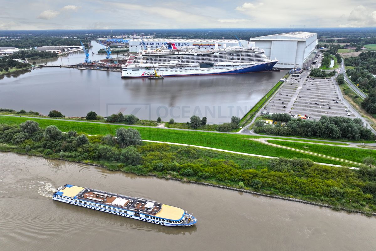 Foto: Swiss Ruby vor Meyer Werft und Carnival Jubilee 10.08.2023