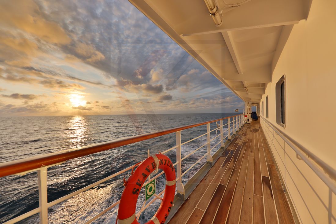 Drei Tage auf See liegen nun vor uns. Drei Tage der Entspannung und Erholung auf den weitläufigen Außendecks. Diese sind auf der MS Seaventure noch zum Großteil mit Teakholz belegt, was einen sehr maritimen und hochwertigen Eindruck vermittelt. Überall an Bord sind in den Außenbereichen, die gerade nicht von Gästen genutzt werden, Crewmitglieder damit beschäftigt, eine Grundreinigung durchzuführen. Damit ändert sich schon an den ersten Seetagen der äußerliche Gesamteindruck deutlich zum Positiven. Die See zeigt sich ruhig, nur die für den Nordatlantik typische Dünung bewegt die MS Seaventure etwas. Das Entertainmentprogramm beschränkte sich an den drei Seetagen auf den Bordmusiker Paulo Terrao, der als erstklassiker Künstler bezeichnet werden kann. Sein Repertoire ist in gewisser Weise begrenzt, was zu diesem Zeitpunkt jedoch noch nicht „eintönig“ wirkt.