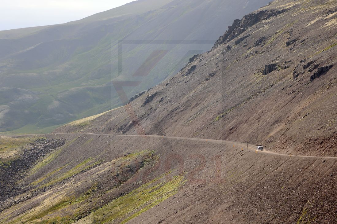 Mit einem kleinen Bus geht es heute zum Dynjandi-Wasserfall. Dieser Wasserfall ist aufgrund seiner Höhe von 100m und einer oberen Breite von 30m besonders eindrucksvoll. Unterhalb des Hauptwasserfalls (dem Dynjandi) folgen noch fünf weitere Stufen, die als eigene Wasserfälle jeweils andere Namen haben. Aus dem Tal betrachtet erscheint der Dynjandi daher noch größer als er ohnehin schon ist. Der Wasserfall liegt sehr abgeschieden und ist touristisch wenig erschlossen. Zum Zeitpunkt meines letzten Besuchs führte nur ein einziger Weg von Isafjördur aus zum Wasserfall, den wir auch heute befahren. Zumindest auf dem Hinweg. Von Isafjördur führt die Straße zunächst durch einen Tunnel, dann über eine recht gut ausgebaute Küstenstraße bis zum kleinen Ort Pingeyri (247 Einwohner). Ab dann heißt es „Bergauf“. Allradantrieb ist jedoch nicht mehr nötig. Im Vergleich zu meinem letzten Besuch ist die Vestfjardavegur No60, wie sich die Straße nennt, recht gut ausgebaut worden, besteht aber immer noch aus porösem Vulkangestein. Es gibt keine Leitplanken oder Befestigungen zur Schlucht hin.
