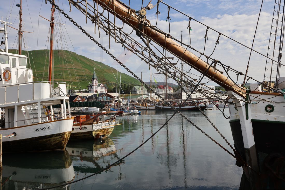 Nach diesem informativen Besuch steht nun das Whale Watching auf dem Programm. Die Fahrt führt ins benachbarte Husavik, jenen Ort, den wir gestern mit dem Schiff anlaufen sollten. Husavik wird oft als die Hauptstadt des Whale Watching in Europa bezeichnet. Das liegt jedoch nicht an der Vielzahl an Walen, die dort während der Ausfahrten zu sehen sind, sondern vielmehr an der Tatsache, dass bei nahezu jeder Ausfahrt mindestens einer zu erspähen ist. Wie ich erfahre, hält sich die Anzahl der gesichteten Tiere in den letzten Wochen sehr in Grenzen, weshalb ich einen Aufenthalt in der beschaulichen Stadt Husavik bevorzuge und nicht an der Bootsfahrt teilnehme. Hauptsehenswürdigkeit ist zweifelsfrei die 1907 aus norwegischem Holz erbaute, evangelische Húsavíkurkirkja. In der Nähe des Hafens befindet sich das Walmuseum, das vom Europäischen Walzentrum betrieben wird. In Husavik findet man zahlreiche Cafés und Restaurants. Ein wunderbarer Blick über die Skjalfandi-Bucht ist inklusive. Ausflüge in das benachbarte Gebiet des Myvatn-Sees kann man von Husavik aus überall buchen. Die Rückkehr der Walbeobachter verzögert sich um rund 30 Minuten. Es wird danach von 1-2 Walsichtungen berichtet. Rund 5 Stunden nach Ankunft in Husavik setzen wir die heutige Fahrt fort und nehmen Kurs auf den Godafoss Wasserfall. Bedingt durch die verspätete Rückkehr des Walbeobachtungs-Bootes verkürzt sich der Aufenthalt am Wasserfall. Wer nicht besonders gut zu Fuss ist, hat nur die Möglichkeit, den Wasserfall von einem der beiden Flussufer aus zu bestaunen. Da mir die Örtlichkeiten bekannt sind, eile ich für einige, neue Fotos zu den bekannten Fotospots, bevor es auch schon zurück zum Hafen in Akureyri geht.