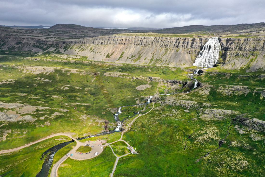 Foto: Dynjandi Wasserfall mit Parkplatz