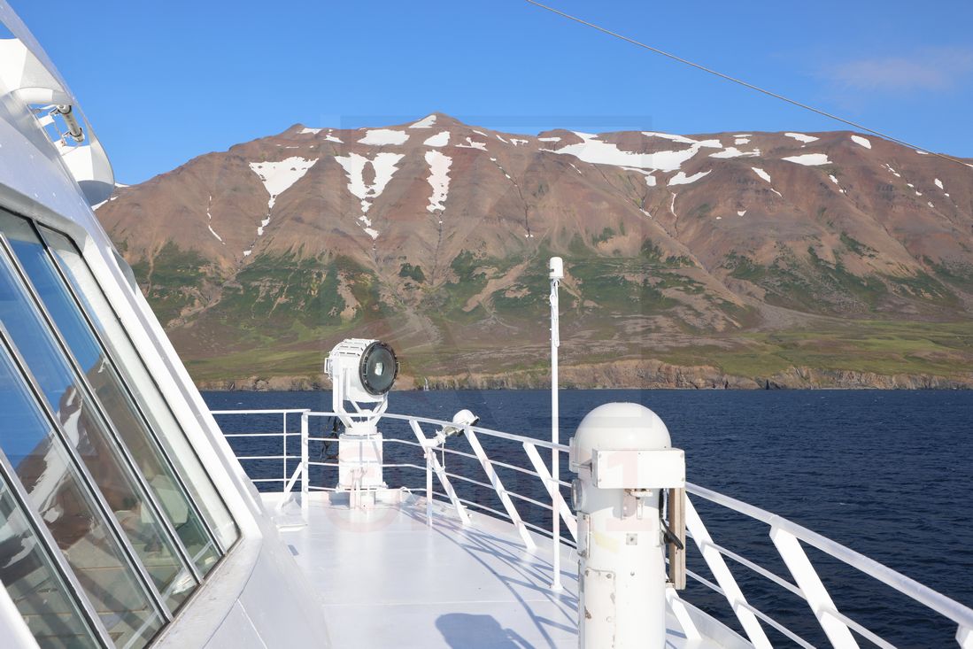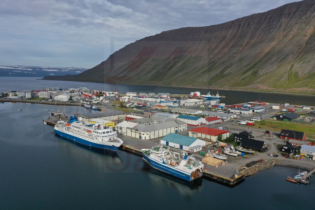 Der äußere Liegeplatz im Hafen von Isafjördur ist heute bereits belegt. Der innere Liegeplatz im Fischereihafen ist nur von Schiffen mit sehr geringer Größe erreichbar. Die MS Seaventure entspricht gerade noch so den örtlichen Vorgaben. Dennoch ist hier perfektes, nautisches Können gefragt. Die Hafeneinfahrt ist extrem schmal, die Fahrrinne unter Wasser von Felsen begrenzt und auf der Backbordseite verläuft auch noch die Start- und Landebahn des kleinen Flughafens. Die 2.500 Einwohner zählende Stadt liegt eingebettet zwischen bis zu 832m hohen Berghängen. Isafjördur ist das Wirtschafts- und Verwaltungszentrum der Westfjorde und liegt auf einer künstlich aufgeschütteten Sandbank, die eine Halbinsel bildet. Isafjördur war einst der größte Standort für die Shrimps-Fischerei von Island und hat auch heute noch eine große Bedeutung beim Fischfang.
