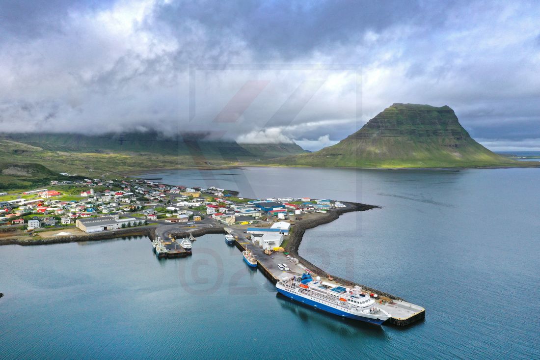 Nach nur 125 Seemeilen ist zunächst der markante und von weither sichtbare Hausberg Kirkjuffel zu erkennen. Die MS Seaventure macht in Grundafjördur fest. In der Regel ist der 463m hohe, keilförmige Berg überhaupt nicht zu sehen, denn diese Region ist bekannt und berüchtigt für ihr schlechtes Wetter sowie viele Nebeltage. Heute zeigt sich das Wetter wechselhaft und voller Kontraste. Der Kirkjuffel, was übersetzt Kirchberg bedeutet, ragt als Halbinsel in den großen Fjord Breidafjördur hinein, wobei er den Seitenfjord Grundarfjördur von der Lagune trennt. Seine sehr markante Form verdankt er den Eiszeitgletschern, die ihn von allen Seiten geschliffen haben. Der Berg besteht, wie die Umgebung darum herum, zum Großteil aus Lava, die in diesem Gebiet mehrere Millionen Jahre alt ist.