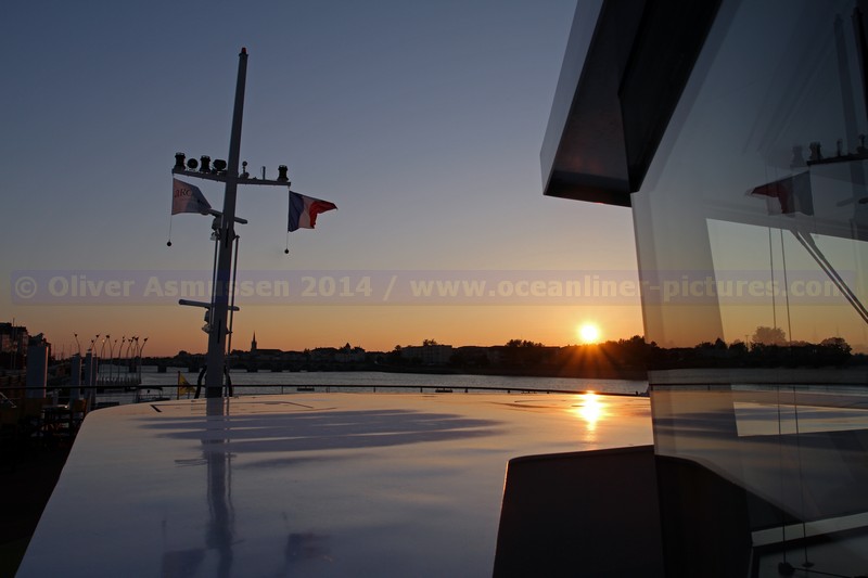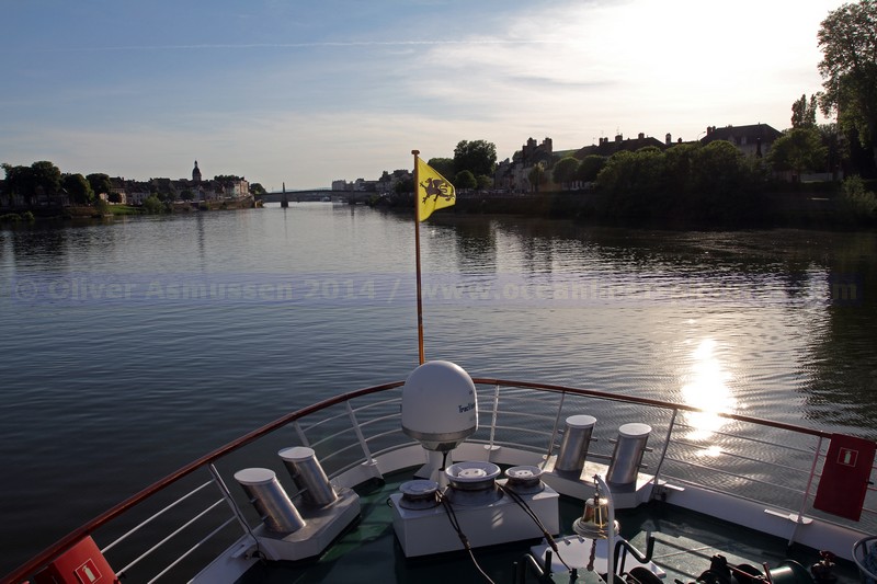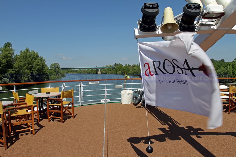 Das Sonnendeck zeigte sich zu dieser Zeit noch leer und die A-ROSA Stella näherte sich langsam der Stadt Mâcon an der Saône. Der Bug der A-ROSA Stella glitt lautlos in die Morgendämmerung hinein, die langsam den Blick auf die Szenerie an Land frei gab und den Fluss in ein diffuses, fast surreales Licht tauchte. Irgendwie rufen diese Eindrücke sofort wieder die A-ROSA Auslaufmelodie „Folowing My Heart“ aus dem Gedächtnis hervor. Genau diese Fluss-Momente sind es nämlich, die dieser Song passender nicht beschreiben könnte.