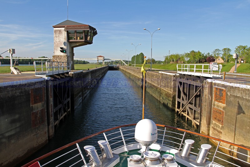 Bei Kilometer 119 durchquerte die A-ROSA Stella die Schleuse von Ormes, die einen Höhenunterschied von 3 m ausgeglichen hat. Die Passage der engen Schleuse wurde in jedem Fall zum Highlight am Abend, denn zwischen Schleusenkammer und Schiffswand lagen gerade einmal 30 cm zu beiden Seiten.