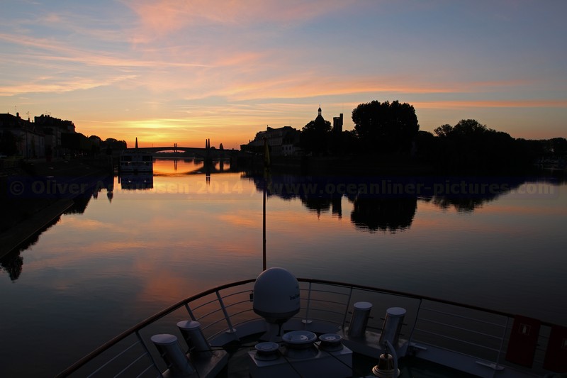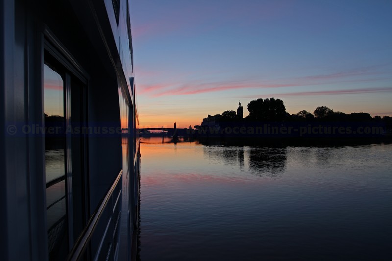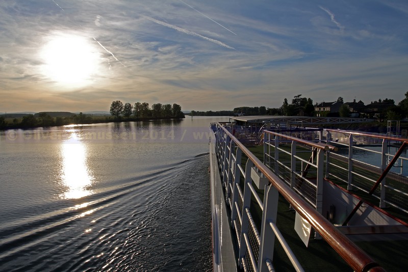 Foto: lautlos bewegt sich die A-ROSA Stella auf der Sâone entlang in die Morgendämmerung hinein