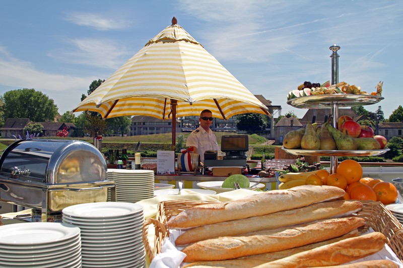 Zurück in Chalon-sur-Saône lockte auf dem Sonnendeck der A-ROSA Stella ein leckeres Barbecue mit unterschiedlichen Fleischsorten vom Grill, frischen Salaten, französischen Baguettes und leckerem Obst. Die Temperaturen kletterten am heutigen Tag auf über 20 Grad und die Sonne strahlte von einem azurblauen Himmel. Das perfekte Wetter also für ein Barbecue an Deck.