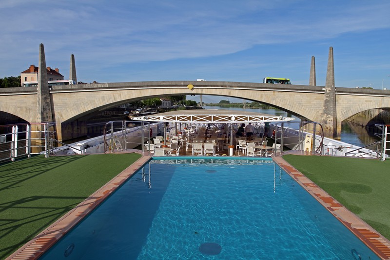 Pünktlich vor Abfahrt der A-ROSA Stella wieder an Bord, legten wir auch schon ab in Richtung Tournus. Ein Teil der Passagiere ist auf diesem Streckenabschnitt nicht an Bord und nimmt an einem Überlandausflug teil. Da die Brücke Saint-Laurent eine deutlich zu niedrige Durchfahrtshöhe aufweist, legte die A-ROSA Stella für ca. 800 m den Rückwärtsgang ein und nahm Kurs auf einen Nebenkanal welcher die Stadt Mâcon und auch die Brücke Saint-Laurent umgeht.
