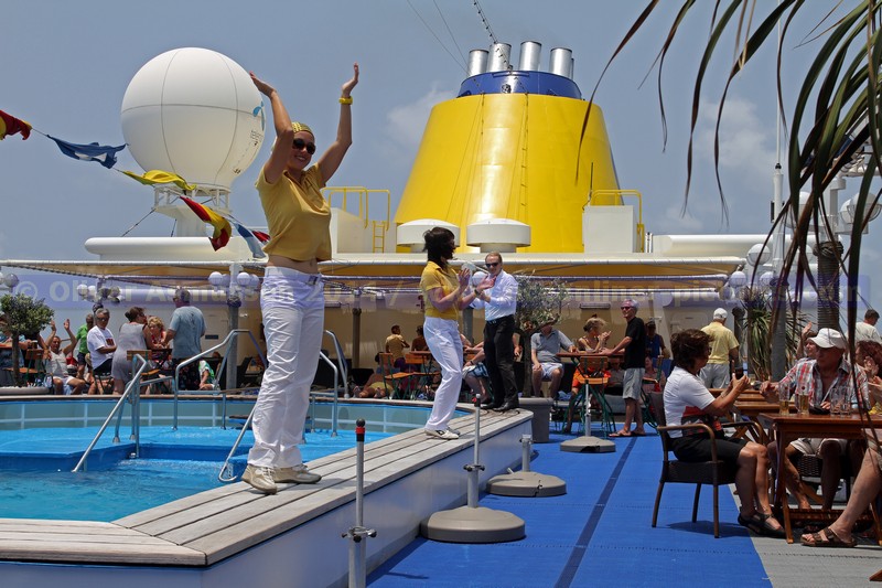 Das Programm für die „großen Kreuzfahrer“ beinhaltete erneut diverse, interessante Programmpunkte für jeden Geschmack. Ausflugsleiterin Jenny hielt in der Lounge wieder interessante Vorträge über die noch bevorstehenden Destinationen und zu späterer Stunde konnten Interessierte ihr Tanzbein zu flotter Musik schwingen oder an einer Runde Aqua-Fitness im Pool teilnehmen.