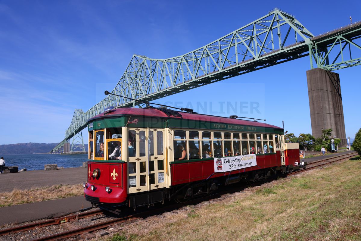 Es werden Ausflüge in die Umgebung angeboten, doch wenn man die Stadt nicht kennt, empfiehlt es sich den Tag hier zu verbringen. Der historische Riverfront Trolley ist eine über 100 Jahre alte Straßenbahn, die früher in San Antonio, Texas unterwegs war. Sie dient nun als Touristenattraktion in Astoria. Entsprechend lang ist die Warteschlange, wenn hier ein Kreuzfahrtschiff anlegt. Da es nur einen Zug gibt, die Hin- und Rückfahrt rund eine Stunde dauert, sind die Chancen einer Mitfahrt entsprechend gering.