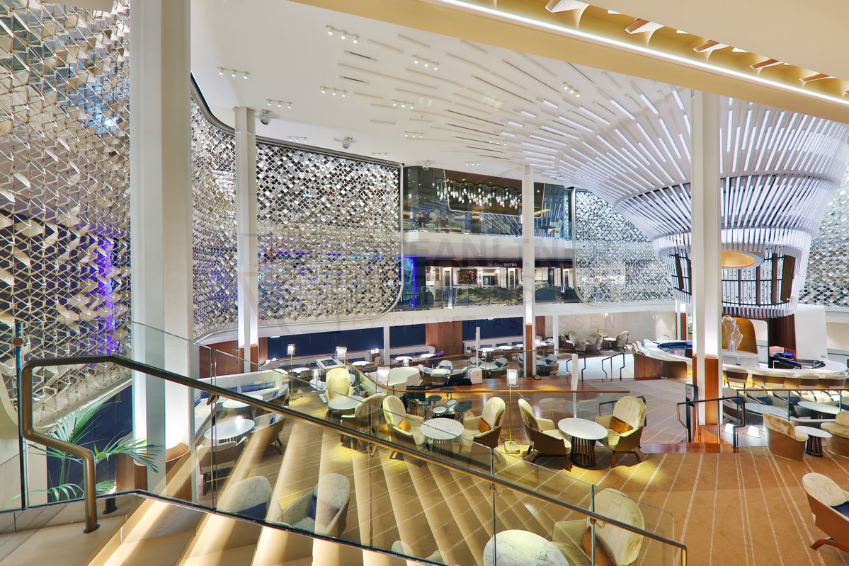 Die Celebrity Edge fällt in jeder Hinsicht auf. Nicht nur, wenn man sich an Bord befindet. Das Außendesign, die Rumpfform, der Schornstein, nichts erinnert an das typische Kreuzfahrtschiffdesign der letzten Jahrzehnte. Mit 130.818 BRZ und 306m Länge bricht das Schiff zwar keine neuen Größenrekorde, doch das ist auch gar nicht notwendig, um zu beeindrucken. Maximal finden an Bord 2.910 Passagiere in 1.454 Kabinen Platz. Damit liegt die Passenger Space Ratio (PSR) bei 44,9, was deutlich über dem Durchschnitt von 30 der meisten großen Kreuzfahrtschiffe liegt. Auch die Passenger Crew Ratio (PCR) überzeugt mit einem Wert von 2,2 was bedeutet, dass jedes Crewmitglied durchschnittlich zwei Passagiere zu betreuen hat. Bei Mainstreamschiffen im Volumensegment liegt der Wert bei 3 oder 4. Celebrity Cruises selbst positioniert die Schiffe im Premium-Segment.