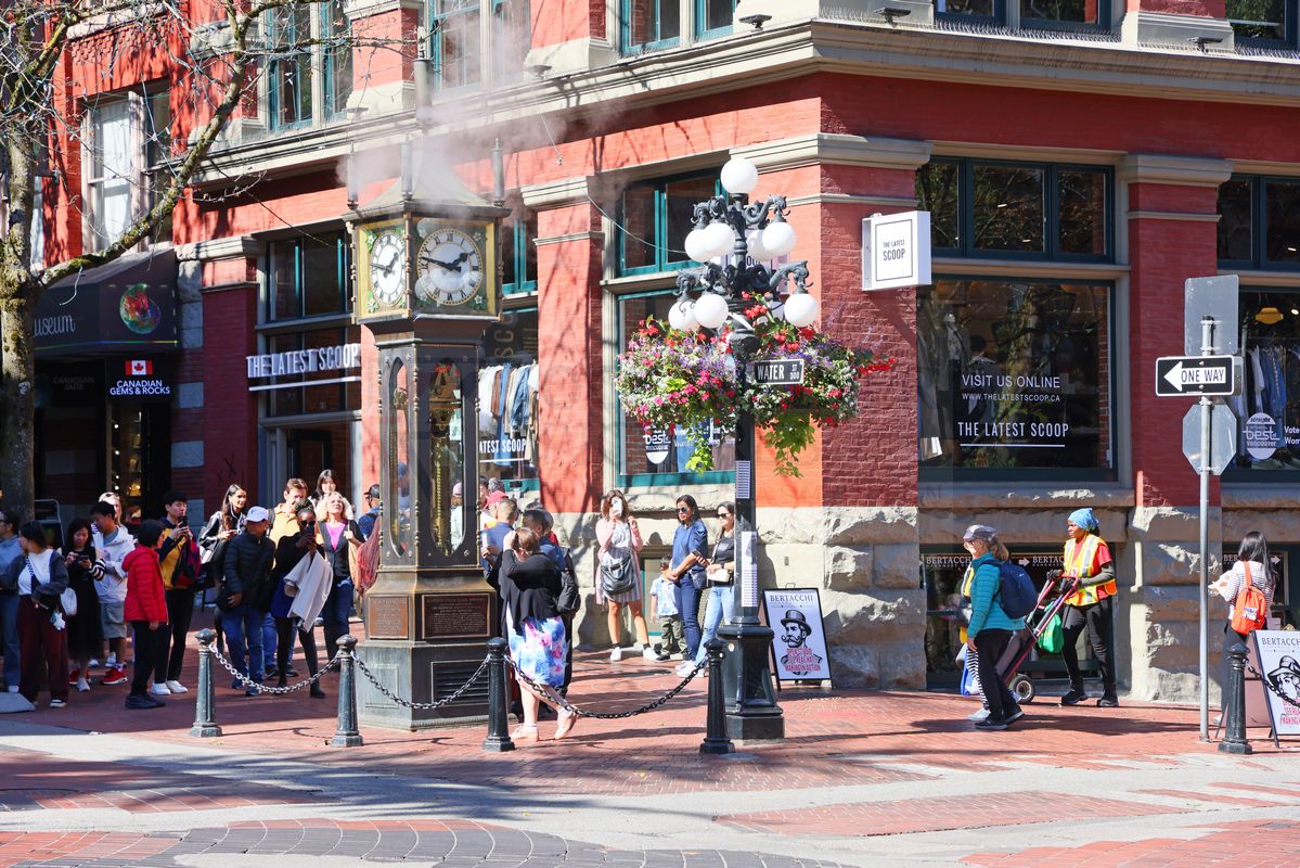 Da ich unbedingt noch die Gastown Steam Clock anschauen möchte, verlasse ich die Aussichtsplattform nach kurzer Zeit wieder. Im Stadtteil Gastown spürt man die Geschichte der Stadt wie nirgends sonst in Vancouver. Im Jahr 1867 eröffnete hier das erste Lokal, im April 1886 erhielt Gastown Stadtrechte und wurde zur City of Vancouver. Gastown ist heute ein Touristenmagnet mit hervorragenden Restaurants, Bars und Pubs. Sowohl tagsüber als auch am Abend ist Gastown unbedingt einen Besuch wert. Sehenswürdigkeiten im klassischen Sinne gibt es jedoch eigentlich keine. Eine Ausnahme ist die Gastown Steam Clock. Es ist die 1977 erbaute, weltweit erste mit Dampf betriebene Uhr. Zu jeder vollen Stunde ertönen alle 12 Töne der Dampfpfeifen und alle 15 Minuten ist eine der Dampfpfeifen zu hören. Theoretisch. Die Uhr geht nämlich nicht ganz genau, wie sich herausstellt.