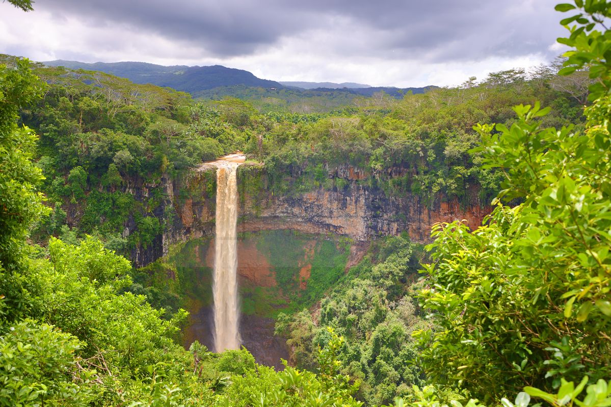 Direkt im Anschluss daran geht es zum Chamarel Waterfall sowie in den Chamarel Seven Colored Earth Geopark. Genauer gesagt befindet sich auch der imposante Wasserfall in diesem Park. Auf dem Weg dorthin lohnt ein Stopp am Chamarel View Point, von dem aus sich ein schöner Blick über die Südwestküste von Mauritius bietet. Wenn man die Siebenfarbige Erde und den Wasserfall anschauen möchte, sind inzwischen umgerechnet pro Person rund 14,- EUR fällig. Am Wasserfall hat man von zwei unterschiedlichen Aussichtsplattformen eine freie Sicht auf den 100m hohen Wasserfall. Dieser lässt aufgrund der starken Regenfälle in den letzten Tagen eine große, statt zwei kleinerer Wasserkaskaden in die Tiefe donnern. Leider ist das Wasser aufgrund von ausgeschwemmten Sedimenten heute nicht klar, sondern bräunlich. Die etwas schönere Sicht auf den Wasserfall bietet sich von der oberen Aussichtsplattform aus, die nur über Treppen erreichbar ist. Der Wasserfall wird von drei Bächen gespeist.