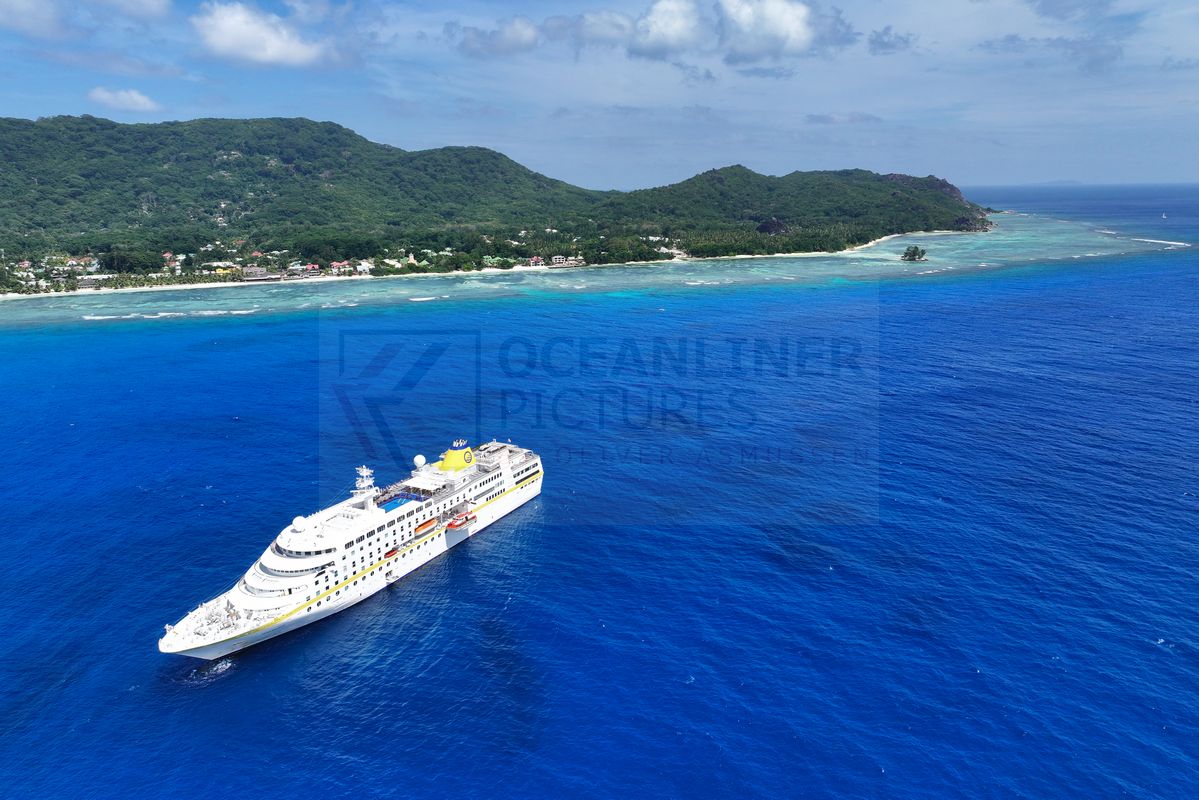 Am Morgen des 20. Februar ankert die HAMBURG zunächst vor der Insel Praslin. Da ich das Tal Valleé de Mai und einige Strände auf Praslin bereits während meines letzten Besuchs, Anfang Februar, erkundet habe, ist mein Ziel heute direkt die Insel La Digue. Auch diese konnte ich während meines längeren Aufenthaltes vor zwei Wochen bereits ausgiebig erkunden (Reisebericht Teil 3) und alle Schönheiten genießen. Aus diesem Grund plane ich heute einen entspannten Strandtag ein, bis die HAMBURG am Nachmittag dort eintrifft. So sieht zumindest mein Plan heutiger Plan aus. Ich fahre deshalb mit der öffentlichen Schnellfähre vom Hafen auf Praslin hinüber nach La Digue. Das Kreuzfahrtschiff Le Bougainville anket bereits vor dem Hafen.