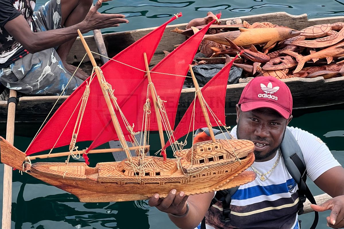 Nach einem kleinen Rundgang durch die Stadt Andoany entschließe ich mich dazu, zurück an Bord der HAMBURG zu kehren. Bei meinem Besuch vor 10 Jahren versäumte ich es, mir eines der großen, handgefertigten Holz-Segelboote zu kaufen, welche von einigen „fliegenden“ bzw. „schwimmenden“ Händlern angeboten werden. Die Händler kommen immer noch mit ihren kleinen Pirogen direkt an die Tenderpier der HAMBURG. Zwar in etwas geringerer Anzahl als noch vor 10 Jahren, aber es gibt sie noch und so kann ich das Versäumnis von meinem letzten Besuch tatsächlich heute nachholen. Glücklicherweise ist auch eine Zahlung mit Euro möglich. Da ich mich nicht für eines der Unikate entscheiden kann, erwerbe ich am Ende alle drei Segelschiffe gleicher Größe.