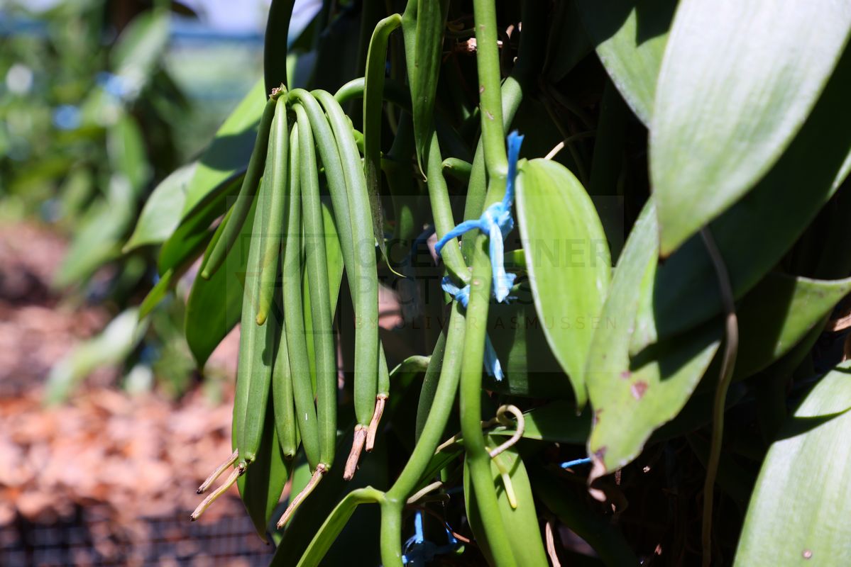 Foto: noch grüne Vanilleschoten an einem Strauch