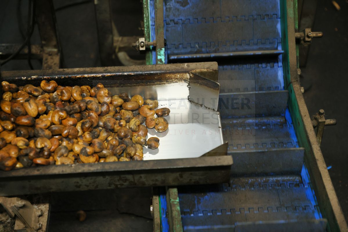 Die Gewinnung der Kerne ist relativ aufwändig, meist arbeiten Frauen in den großen Fabriken. Die Verarbeitung birgt viele gesundheitliche Risiken, denn die Nüsse müssen mit speziellen Maschinen geknackt werden und das Öl in der Kernschale ist giftig – es löst Verätzungen beim Berühren aus. Die Arbeiterinnen sind meist ohne Schutzkleidung in den Fabriken tätig. Um die Hände vor Verätzungen durch das Restöl an den Schalen zu vermeiden, tauchen sie die Hände in Speiseöl oder tragen Einweg-Plastikhandschuhe. Um die Schale von den Kernen zu entfernen, sind aufwändige Trocknungsverfahren notwendig. Die letzte, dünne Kernhaut entfernen die Arbeiterinnen ebenfalls per Hand. Die von uns besuchte Fabrik produziert bereits nach „Fair Trade Richtlinien“, was Kinderarbeit, Menschenrechtsverletzungen und Umweltschäden minimiert.