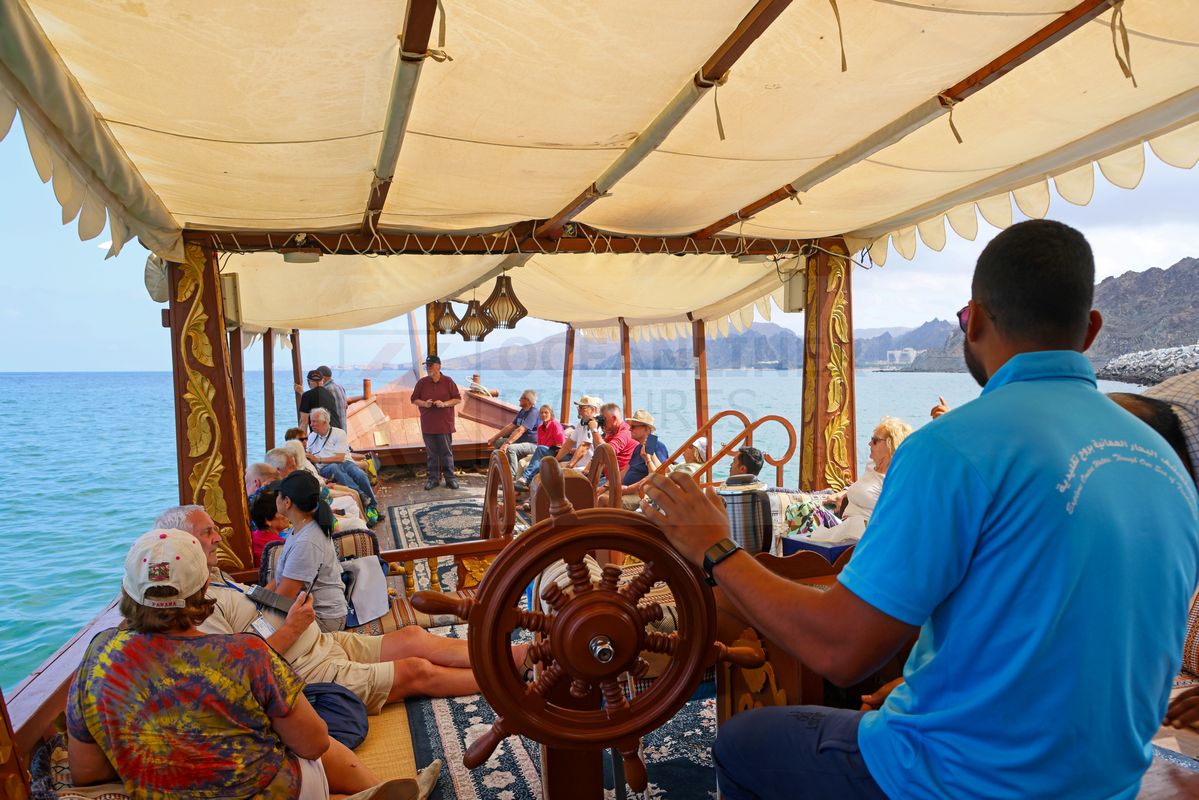 Am 07. März erreichen wir gegen Mittag den Hafen von Muscat, der Hauptstadt des Oman. Während in den letzten Wochen eher die Einfachheit und traditionelle Lebensstile vorzufinden waren, so tauchen wir nun in eine moderne Welt ein, in der Urlauber mit gehobenen Ansprüchen ihren Urlaub verbringen. Die arabische Halbinsel ist schon länger ein Anlaufpunkt für Urlauber, die eher Marmor, Gold, prunkvolle Bauten und Luxus bevorzugen. Allerdings reicht die Geschichte von Muscat bis in die Antike zurück. Das Gebiet um Muscat wurde bereits vor rund 4.000 Jahren besiedelt. Muscat verzaubert durch seine Lage, sein orientalisches Flair und den hohen Lebensstandard. Alles steht in perfektem Einklang zueinander. Muscat ist an der einen Seite vom Golf von Oman und an der anderen Seite von den Bergen des Hadschar-Gebirges umgeben. Heute steht eine Dhau-Fahrt auf dem Plan, da eine Stadtbesichtigung nur bedingt lohnenswert wäre. Die Moscheen schließen um 11:00 Uhr, also vor unserer Ankunft in Muscat.