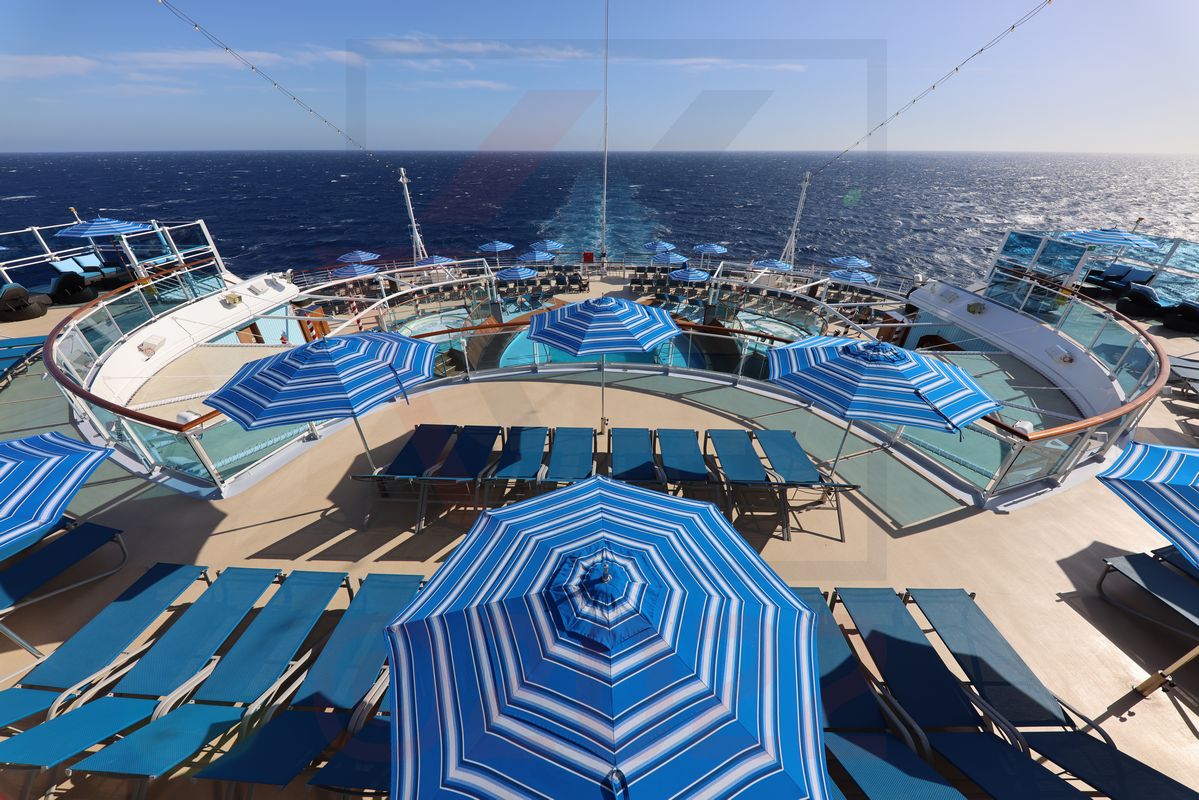Ein größerer Mehrzweckplatz kann für verschiedene Arten von Ballspielen genutzt werden. Das Heck wird von einer Terrasse halb umschlossen, sodass viel Platz für Sonnenliegen entsteht. Auch das kennt man von älteren, klassischen Kreuzfahrtschiffen.