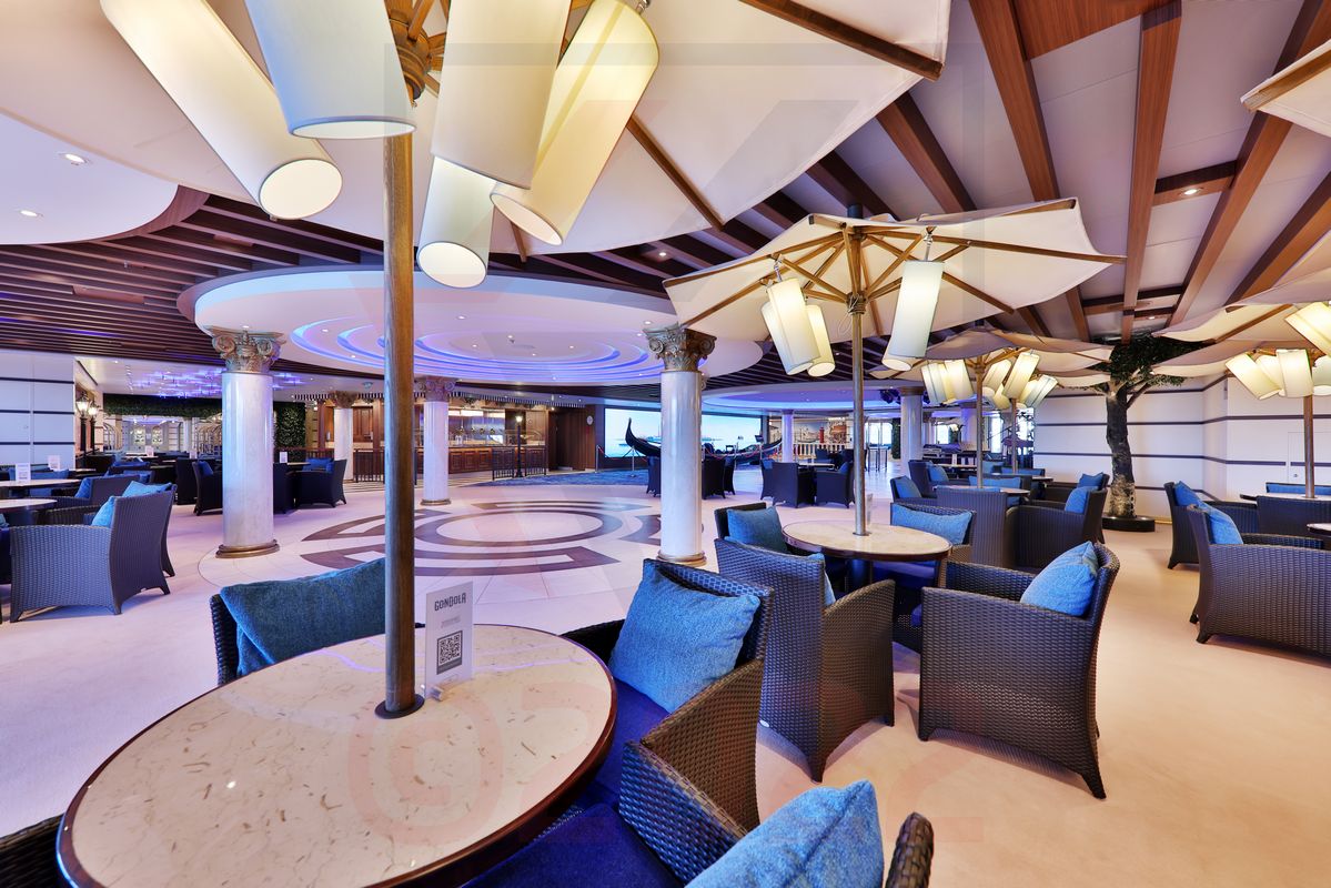 Die Gondola Lounge ist ein weiterer, zentraler Treffpunkt an Bord. Blickfang ist auch hier eine echte, venezianische Gondel, die vor einer LED-Wand steht, deren Bilder sich im Verlauf des Tages ändern. In dieser Gondel kann man sich fotografieren lassen, wahlweise zum Sonnenuntergang oder doch lieber unter der Mittagssonne Norditaliens. In der Mitte der offen gestalteten Lounge befindet sich eine Tanzfläche. In die Lounge integriert sich eine Bar, die auch über einen Außenbereich verfügt. Die Gondola Lounge erweckt den Eindruck, sich auf einer kleinen Piazza in Venedig zu befinden. Hier kann man abends in den Erinnerungen des Tages schwelgen und zu aktuellen Musiktiteln das Tanzbein schwingen.