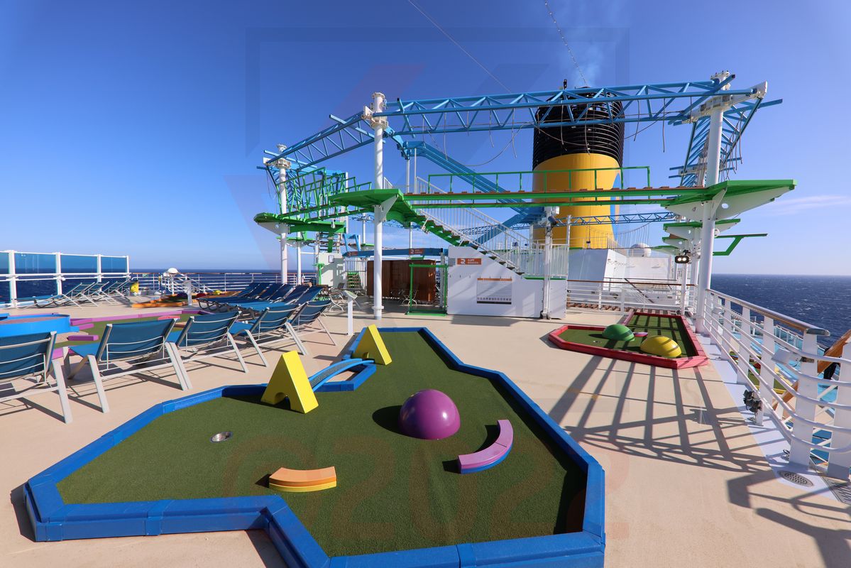 Ein kleiner Minigolfplatz sorgt bei der ganzen Familie für Spielspaß. Besonderes Highlight ist der Rope Garden, ein Klettergarten auf See. Das ist nicht neu in der Branche, aber auf der Costa Venezia integriert er sich hervorragend in die anderen Spielbereiche. Ganz am Heck sind einige Außenfitnessgeräte installiert, von denen aus sich ein freier Blick auf das Meer bietet. Eine gelungene Alternative zu den bisher bekannten, innen befindlichen Fitnessbereichen. Die Nutzung des Klettergartens kostet aktuell 30,- EUR pro Person, was sich bei einer vierköpfigen Familie ordentlich auf dem Bordkonto bemerkbar macht.