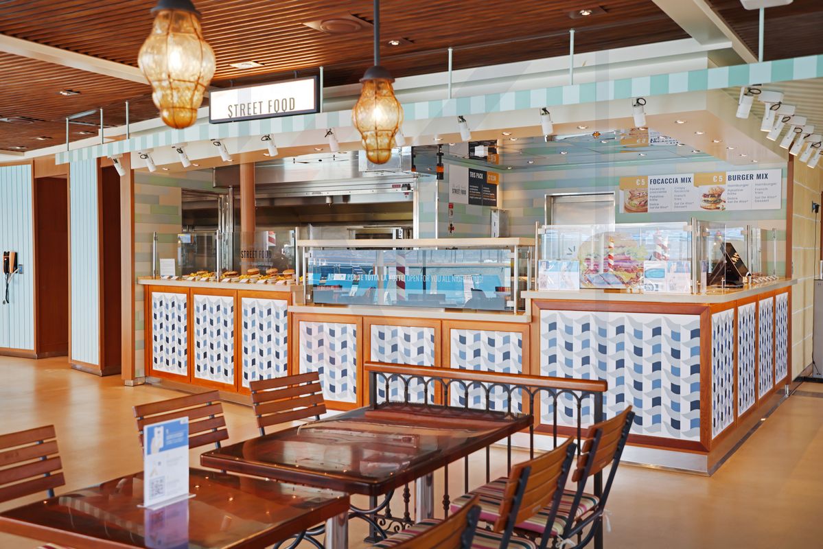 Rund um den großen Burano Pool reihen sich Bistros und eine Bar. Dazu gehört ein Street Food Bereich. Hier sind unterschiedliche Burger sowie andere Snacks für den kleinen Hunger zwischendurch zu bekommen. Die Snacks sind allerdings nicht im Reisepreis enthalten. Mit 3,50 – 9,- EUR für einzelne Burger oder Burger-Menüs halten sich die Kosten dennoch in Grenzen. Die Qualität ist gut, wenn auch nicht so herausragend wie in vergleichbaren Locations auf anderen Kreuzfahrtschiffen. Die Gerichte lassen sich nicht mit individuellen Toppings und Saucen verfeinern oder variieren. Das ist etwas schade.