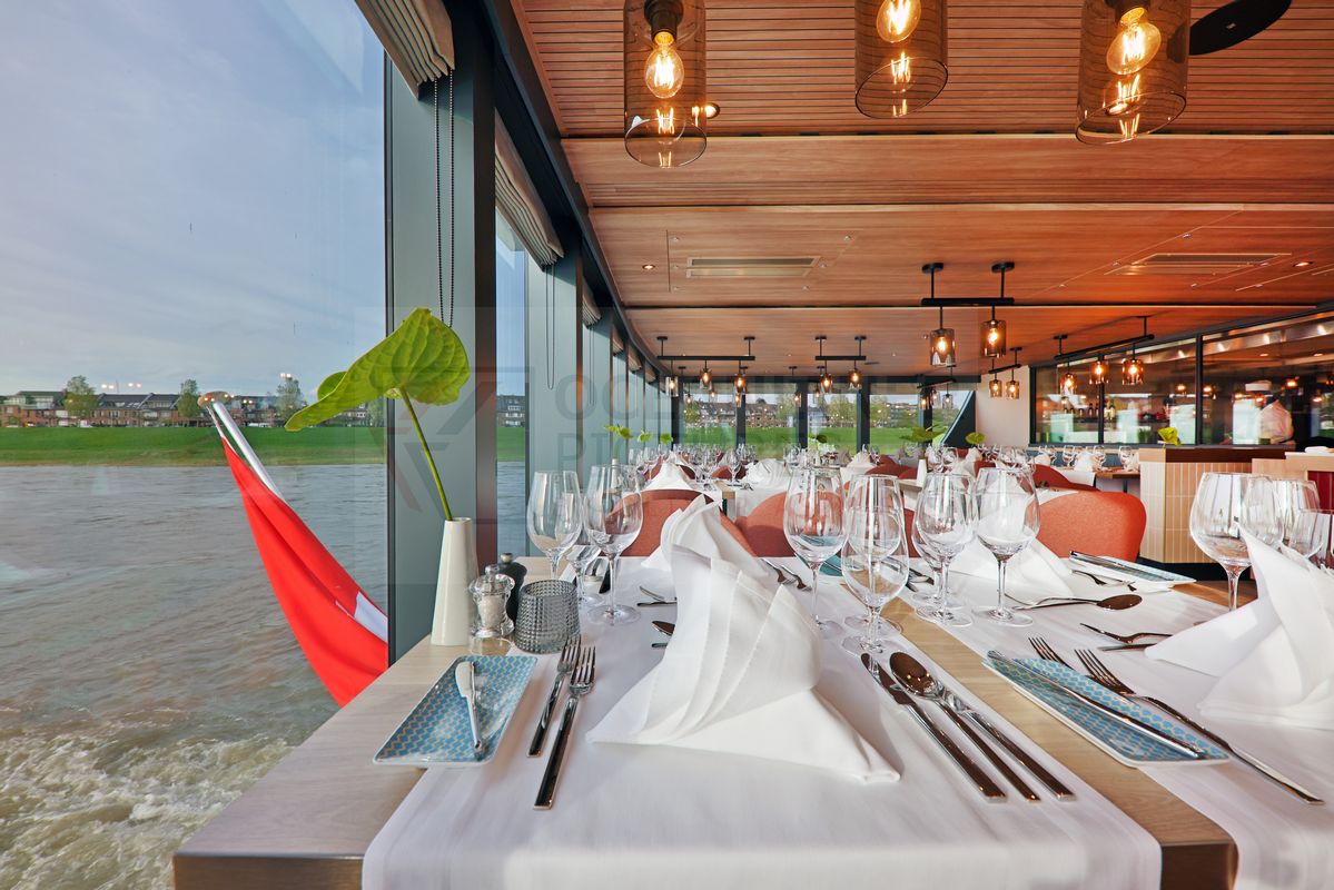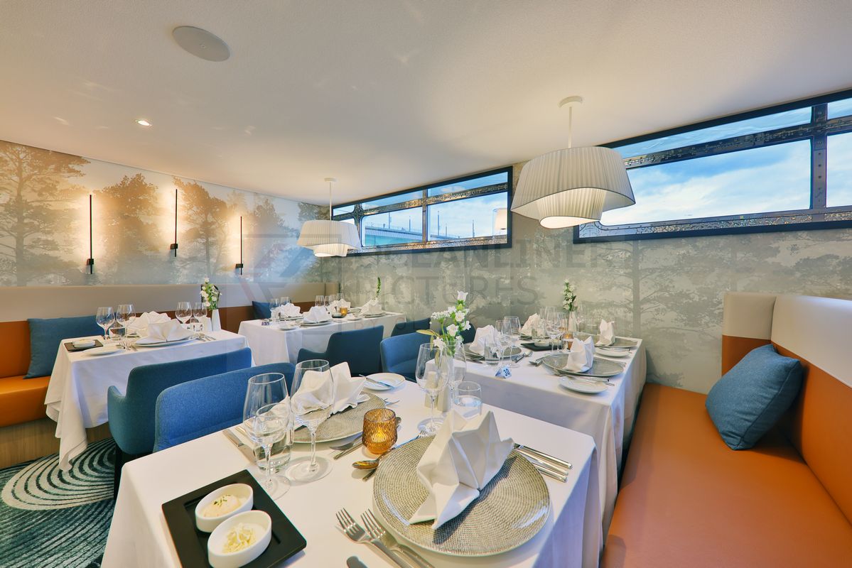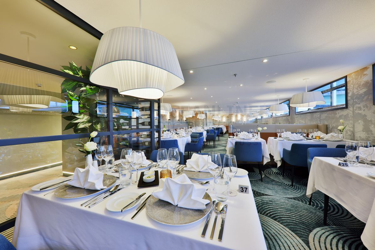 Ein Treppenhaus verbindet alle drei Decks miteinander, neu ist die Installation von gleich zwei Fahrstühlen. Auf dem unteren Neptundeck befinden sich durchgehend Zweibett-Kabinen (Fenster nicht zu öffnen) und – das ist neu – das AMINA-Restaurant. Dieses unterteilt sich nun in zwei Bereiche, entzerrt dadurch die Personenanzahl. Eine Besonderheit zeigt sich im Amina Restaurant, denn es bietet nur eine sehr eingeschränkte Aussicht vom untersten Deck aus. Ob das nun ein positiver oder negativer Aspekt ist, muss jeder Reisende für sich selbst entscheiden. Ich bin ja prinzipiell ein bekennender Freund von großen Fenstern, damit ich auch einen Blick auf die vorbeiziehende Landschaft werfen kann, was ja bei einer Flusskreuzfahrt ein wesentlicher Bestandteilt ist. Und nun folgt das „Aber“, denn es ist ja so, dass es in keinem Restaurant ausschließlich Fensterplätze gibt und wenn man keinen dieser begehrten Sitzmöglichkeiten ergattert, dann ist die Sicht von den hinteren Plätzen auf nahezu jedem Schiff eingeschränkt. Ältere Phoenix-Schiffe wie zum Beispiel die Alina oder Amelia bieten Restaurants auf zwei Ebenen, darunter eine mit Panoramafenstern und eine ohne Aussicht. Eine Aufteilung die immer wieder für Spannungen sorgt. Auf der AMINA gibt es all die „Probleme“ nicht. Im Grunde ist es egal, an welchem Platz man sitzt. Allein die Tischgröße ist ein Kriterium. Deshalb denke ich, dürfte die anfängliche Kritik an diesem neuen Restaurant auf der AMINA bald wieder verstummen.
