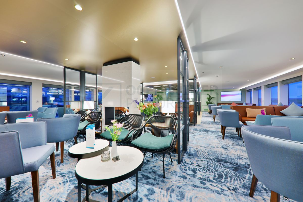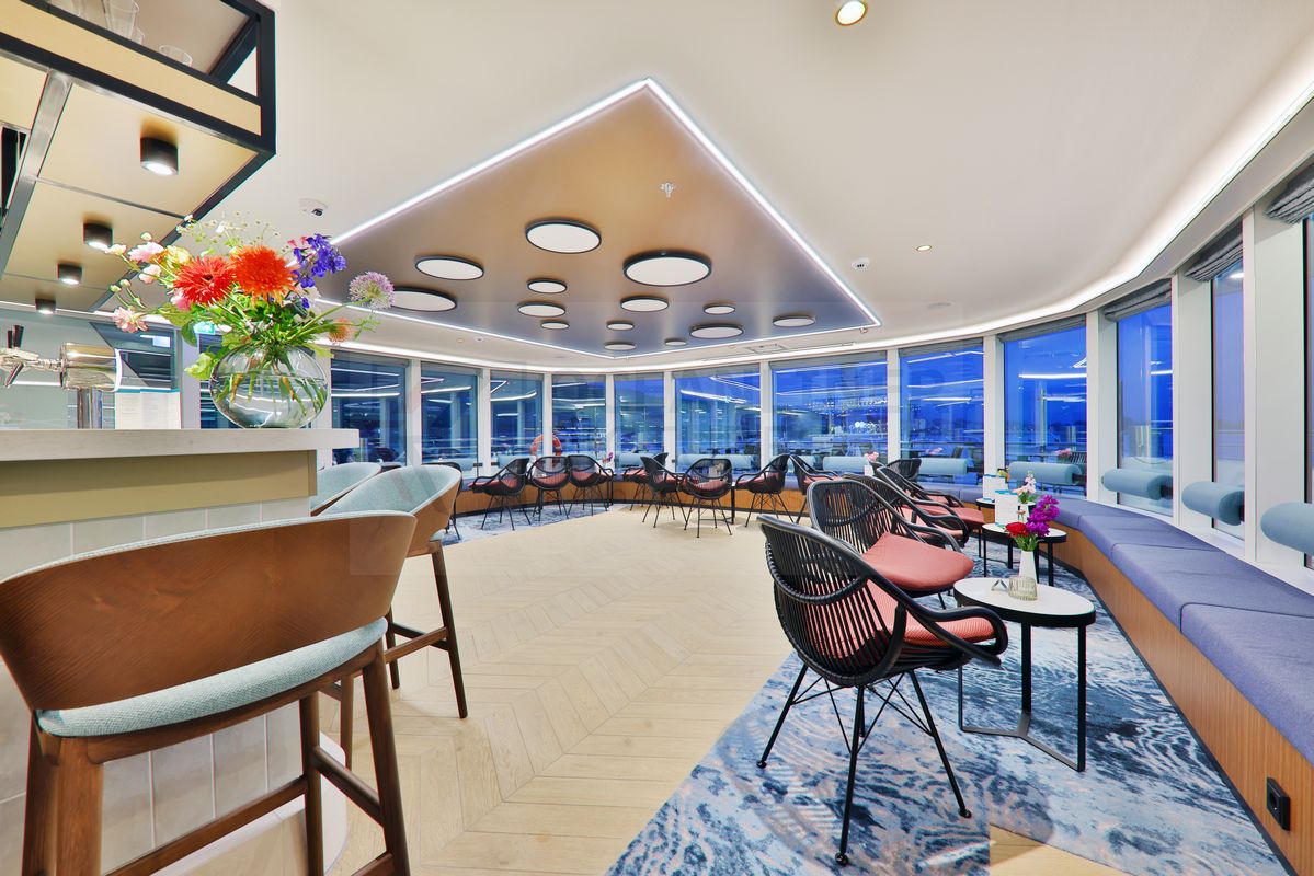 Die Lounge wurde komplett neugestaltet und aufgeteilt. Nichts erinnert an die bisherigen Schiffseinheiten. Insgesamt wirkt die Lounge noch etwas gemütlicher, denn wie schon im Foyer wurde hier eine grüne Trennwand mit Pflanzen installiert. Eine Leseecke sowie ein Kamin mit künstlicher Flamme sorgen für weitere Gemütlichkeit. Vor dem Treppenabgang zur Bar befindet sich eine kleine Kaffeestation sowie ein Bereich, der unterschiedlich genutzt werden kann. Wenn die Lounge voll besetzt ist, zeigt sich eine gewisse Enge, denn dann ist es mitunter schwierig, zwischen den Stühlen entlangzulaufen.