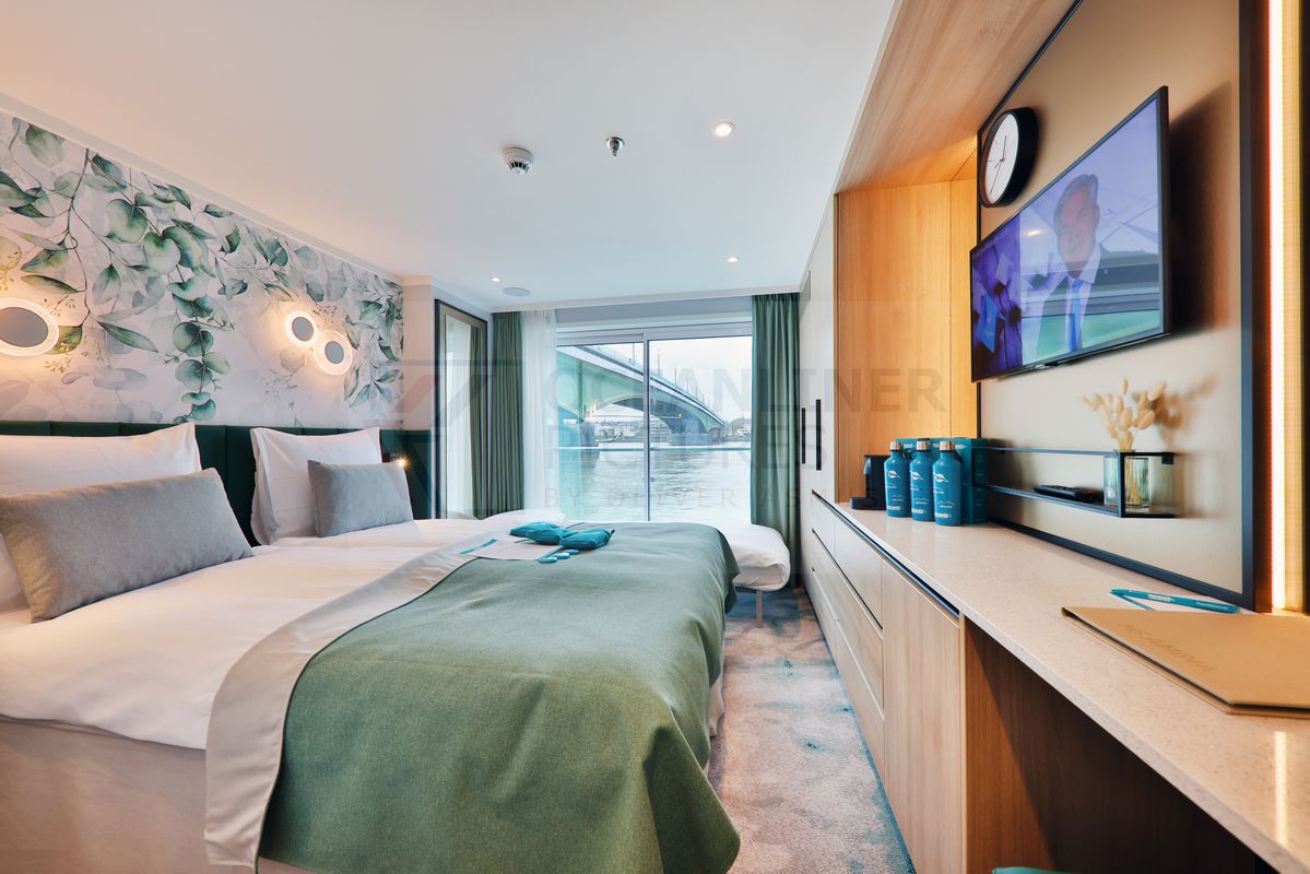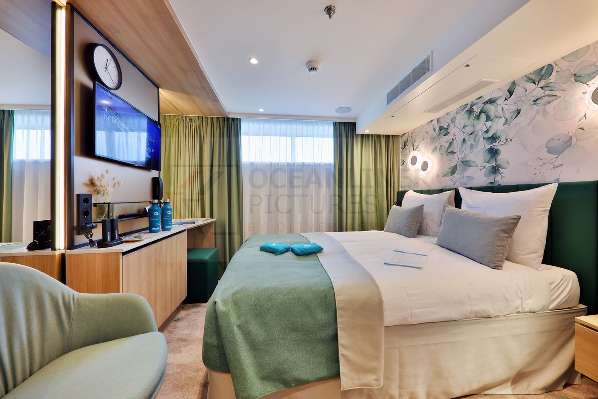 Alle Kabinen liegen außen, sind komfortabel und gemütlich ausgestattet und verfügen sowohl auf dem Saturn- als auch auf dem Oriondeck (50 bzw. 42 Kabinen) über einen französischen Balkon. Die 12 Kabinen auf dem unteren Neptundeck haben kleine Fenster, die nicht zu öffnen sind, aber ausreichend Tageslicht in die Kabine fallen lassen. Auf dem unteren Neptundeck befinden sich 10 Kabinen weniger als auf den älteren Schwesterschiffen, dafür ist die Gesamtanzahl an Kabinen gestiegen. Zur Ausstattung gehören Dusche/WC, Fön, individuell regulierbare Klimaanlage, SAT-TV (in der Regel sind auch Deutsche Programme zu empfangen), Radio, Minibar, Nespresso-Kaffeemaschine, Safe, Telefon, kleine Tageszeitung und verstellbare Betten. Die Betten lassen sich wahlweise als Doppel- oder Einzelbetten stellen. Interessant dürfte z.B. auch für Familien mit Kindern, welche die Flüsse immer mehr auch als Urlaubsdestination entdecken, die Tatsache sein, dass es an Bord immerhin zwei 3-Bett Kabinen gibt. Diese sind aber tatsächlich nur bedingt zu empfehlen, da sie nicht größer sind als die 2-Bett-Kabinen, nämlich 15m². Das dritte Zusatzbett wird zwischen französischem Balkon und den Doppelbetten aufgestellt. Die Nutzung der Schränke ist dann ebenso eingeschränkt wie der Ein- und Ausstieg der Person, die im Bett am Fenster liegt. Tisch und Stühle fallen in diesen Kabinen weg.