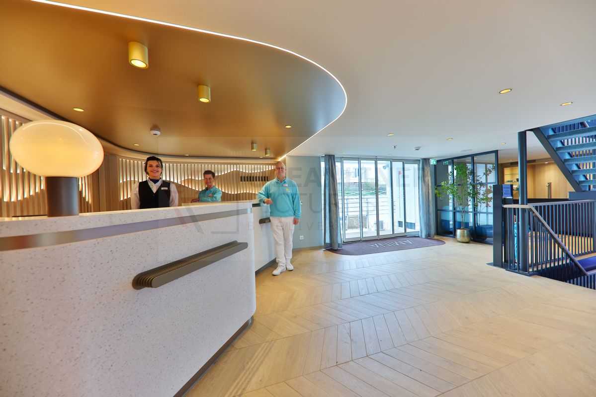 Der Flusskreuzfahrtschiff-Neubau MS Amina von Phoenix Reisen überzeugt gleich nach dem Durchschreiten der großen Glastüren. Das Foyer zeigt sich wie bei den älteren Schwesterschiffen in dezentem, ansprechenden Farbdesign. Sofort ins Auge fällt die LED-Leinwand, die sich über alle drei Decks durch das Foyer erstreckt und dauerhaft einen Wasserfall zeigt. Völlig neu ist die Anordnung der Rezeption und des Phoenix-Schalters, die sich auf dem Saturndeck befinden. Insgesamt wirkt das Foyer wieder wie in einem kleinen Boutique Hotel. Zwei kleine Sitzecken, eine kleine Bord-Boutique und einen Wasserspender findet man ebenfalls im Bereich der Rezeption. Der Weg zu den „neuen“ Kabinen ist hinter einer mit Pflanzen begrünten Trennwand „versteckt“. Der Gesamteindruck ist sehr positiv, insbesondere durch die moderne und ansprechende „Wasserfall-Wand“.
