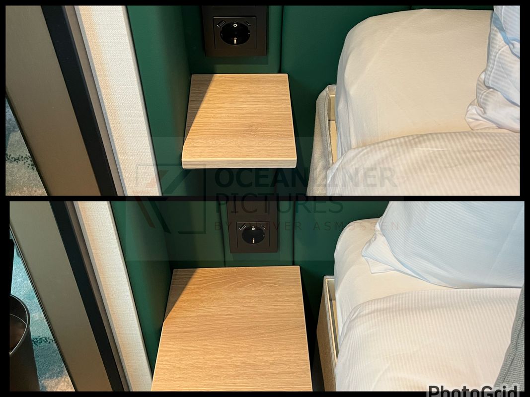 Es gibt einen interessanten Unterschied zwischen den Kabinen auf dem Oriondeck und dem Saturndeck. Interessant dabei ist, dass die Kabinen auf dem Oriondeck kleiner ausfallen als auf dem Saturndeck. Das ist zu erkennen am Nachtschrank. Haben die Kabinen auf dem Saturndeck auf beiden Bettseiten einen kleinen Nachttisch, so steht auf den Kabinen des Oriondecks nur eine kleine Ablagefläche am Bett an der Fensterseite zur Verfügung (s. Foto). Insgesamt macht das nur knapp 1 m² aus, doch vergleicht man die Kabinen miteinander, so fällt der Größenunterschied auf. Ein weiteres Merkmal für die unterschiedlichen Kabinengrößen ist in den Kabinengängen erkennbar. Der Kabinengang auf dem Oriondeck ist einige Zentimeter breiter als au dem Saturndeck.