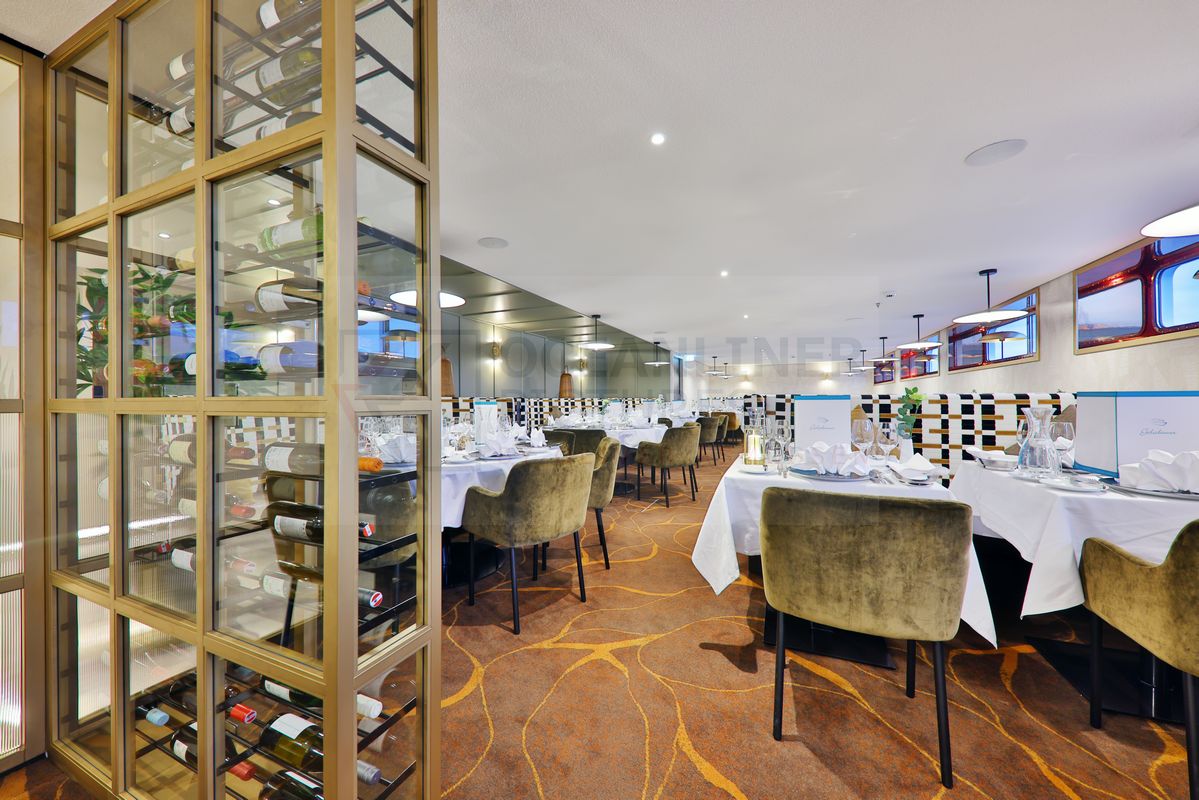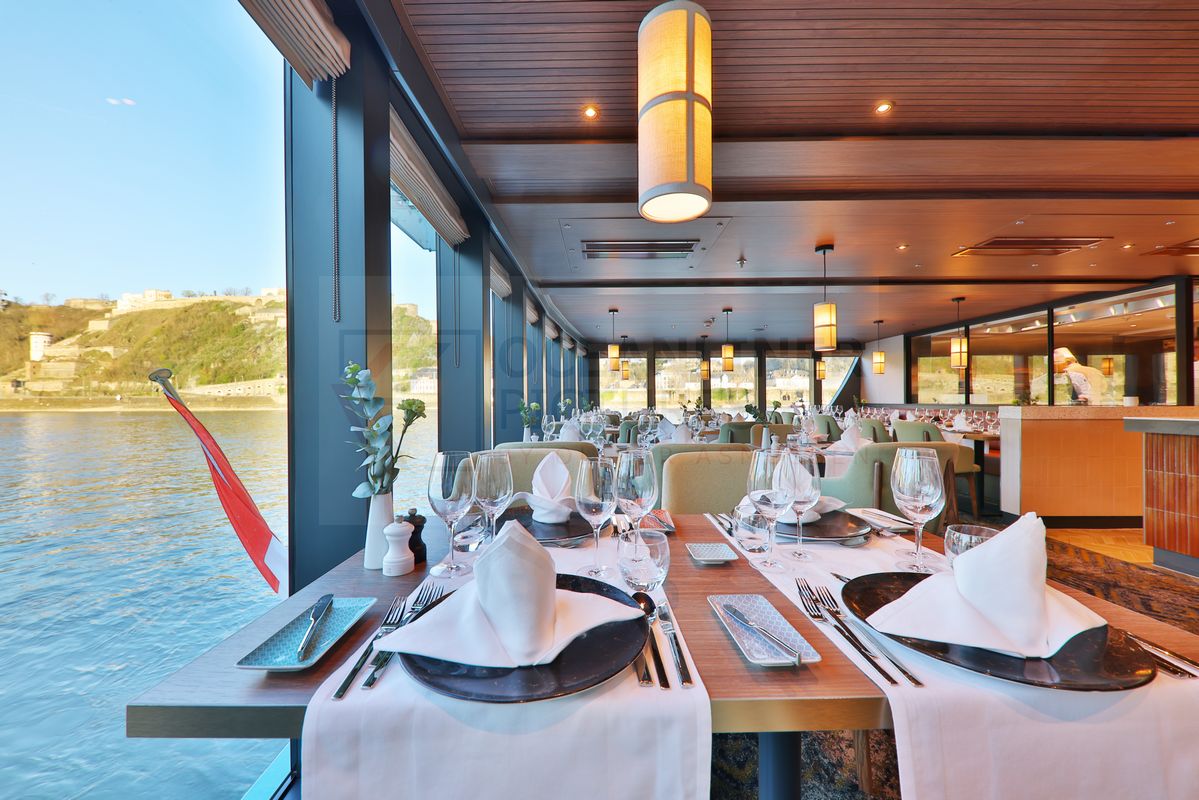 Ein Treppenhaus verbindet alle drei Decks miteinander. Wahlweise stehen Treppen und auch zwei Fahrstühle zur Verfügung. Auf dem unteren Neptundeck befinden sich durchgehend Zweibett-Kabinen (Fenster nicht zu öffnen) und das AURELIA-Restaurant. Dieses unterteilt sich nun in zwei Bereiche, entzerrt dadurch die Personenanzahl. Eine Besonderheit zeigt sich im Aurelia Restaurant, denn es bietet nur eine sehr eingeschränkte Aussicht vom untersten Deck aus. Ob das nun ein positiver oder negativer Aspekt ist, muss jeder Reisende für sich selbst entscheiden. Ich bin ja prinzipiell ein bekennender Freund von großen Fenstern, damit ich auch einen Blick auf die vorbeiziehende Landschaft werfen kann, was ja bei einer Flusskreuzfahrt ein wesentlicher Bestandteilt ist. Und nun folgt das „Aber“, denn es ist ja so, dass es in keinem Restaurant ausschließlich Fensterplätze gibt und wenn man keinen dieser begehrten Sitzmöglichkeiten ergattert, dann ist die Sicht von den hinteren Plätzen auf fast allen vergleichbaren Schiffen eingeschränkt. Ältere Phoenix-Schiffe wie zum Beispiel die Alina oder Amelia bieten Restaurants auf zwei Ebenen, darunter eine mit Panoramafenstern und eine ohne Aussicht. Eine Aufteilung die immer wieder für „Spannungen“ unter den Gästen sorgt. Auf der Aurelia gibt es all die „Probleme“ nicht. Im Grunde ist es egal, an welchem Platz man sitzt. Allein die Tischgröße ist ein Kriterium. Für Reisende, die beim Essen gerne auf die Flusslandschaft schauen, ist die Aurelia eher weniger zu empfehlen.