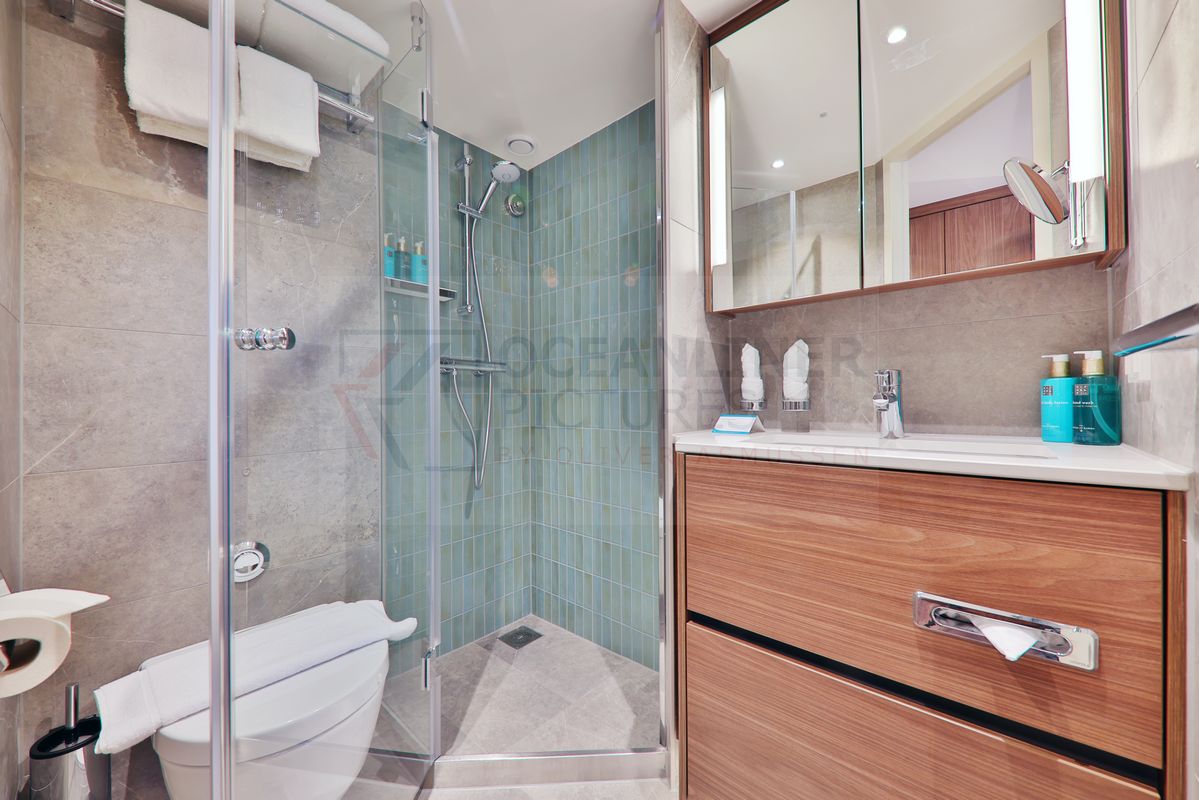 Pfiffig ist das „Nachtlicht“ im Bad, welches sich am Fußboden beim Betreten automatisch einschaltet. Insbesondere beim nächtlichen Toilettengang erweist sich diese Besonderheit als wirklich klasse. Über ein solches „Nachtlicht“ verfügen auch die Nachttische, sodass beim Verlassen des Bettes in der Nacht sofort ein kleines, unaufdringliches Licht angeht und den Weg in der Kabine weist. Das gab es allerdings auch schon auf den älteren Schiffen.