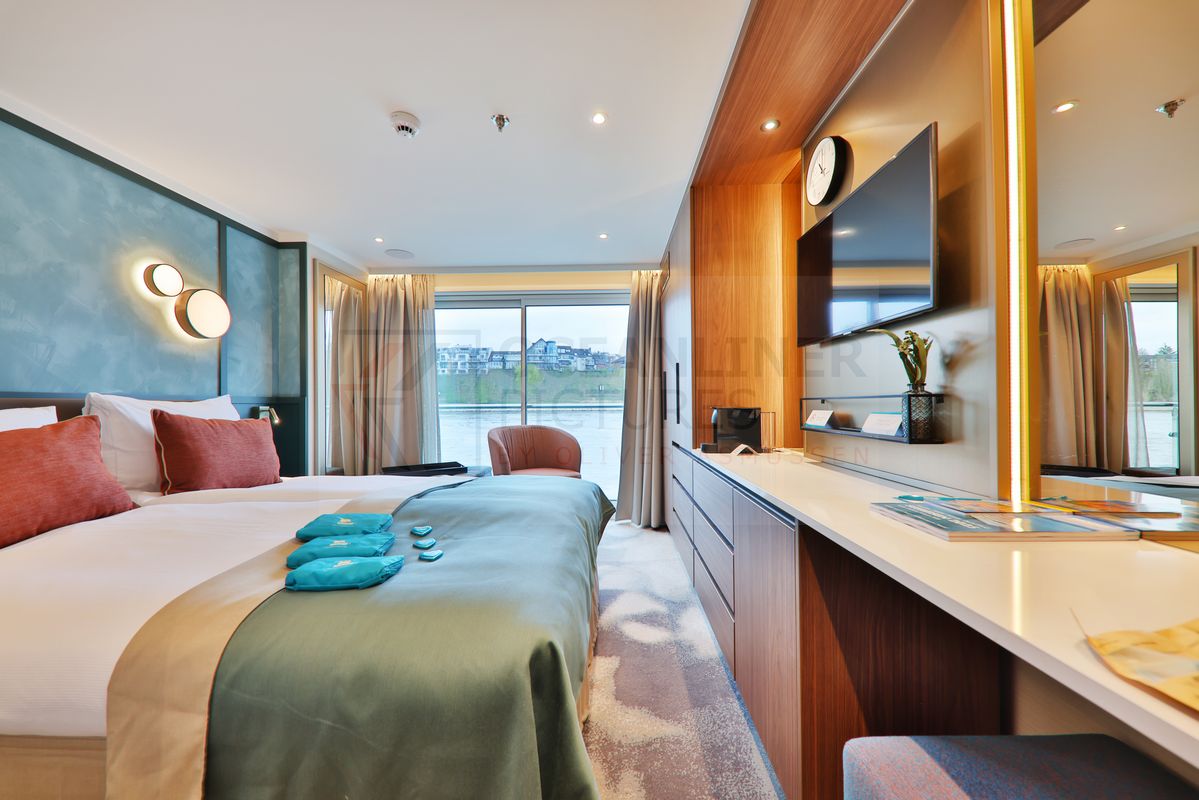Alle Kabinen liegen außen, sind komfortabel und gemütlich ausgestattet und verfügen sowohl auf dem Saturn- als auch auf dem Oriondeck (50 bzw. 42 Kabinen) über einen französischen Balkon. Die 12 Kabinen auf dem unteren Neptundeck haben kleine Fenster, die nicht zu öffnen sind, aber ausreichend Tageslicht in die Kabine fallen lassen. Auf dem unteren Neptundeck befinden sich 10 Kabinen weniger als auf den älteren Schwesterschiffen, dafür ist die Gesamtanzahl an Kabinen gestiegen. Zur Ausstattung gehören Dusche/WC, Fön, individuell regulierbare Klimaanlage, SAT-TV (in der Regel sind auch Deutsche Programme zu empfangen), Radio, Minibar, Nespresso-Kaffeemaschine, Safe, Telefon, kleine Tageszeitung und verstellbare Betten. Die Betten lassen sich wahlweise als Doppel- oder Einzelbetten stellen. Interessant dürfte z.B. auch für Familien mit Kindern, welche die Flüsse immer mehr auch als Urlaubsdestination entdecken, die Tatsache sein, dass es an Bord immerhin zwei 3-Bett Kabinen gibt. Diese sind aber tatsächlich nur bedingt zu empfehlen, da sie nicht größer sind als die 2-Bett-Kabinen, nämlich 14m². Das dritte Zusatzbett wird zwischen französischem Balkon und den Doppelbetten aufgestellt. Bei aufgestelltem Bett ist der verbliebene Platz sehr gering. Das trifft natürlich auch auf den Stauraum zu, der für eine Belegung mit 3 Personen sehr eng bemessen ist. Die Nutzung der Schränke ist dann ebenso eingeschränkt wie der Ein- und Ausstieg der Person, die im Bett am Fenster liegt. Für den Tisch und die Zwei Stühle, die regulär in der Kabine stehen, bleibt bei ausgeklapptem Bett kein Platz mehr.