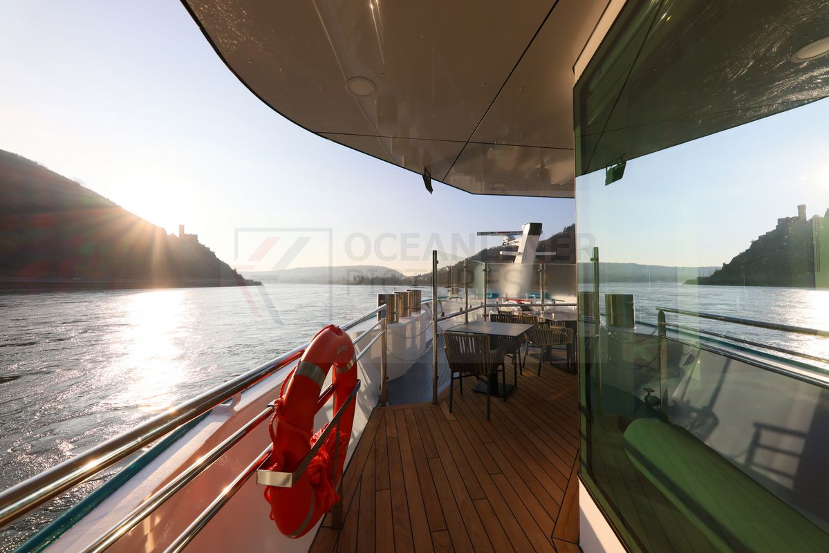 An der Backbordseite der MS Aurelia befinden sich im vorderen Teil der Panorama-Lounge ein Ausgang, über welchen das Sonnendeck sowie die möblierte Terrasse am Bug zu erreichen ist. Große Glasscheiben bieten den nötigen Schutz vor Fahrtwind, nehmen dabei dennoch nicht die Sicht in Fahrtrichtung. Für einen sehr maritimen Eindruck sorgt der Fußbodenbelag aus Echtholz, der heute kaum noch auf Schiffen zu finden ist.