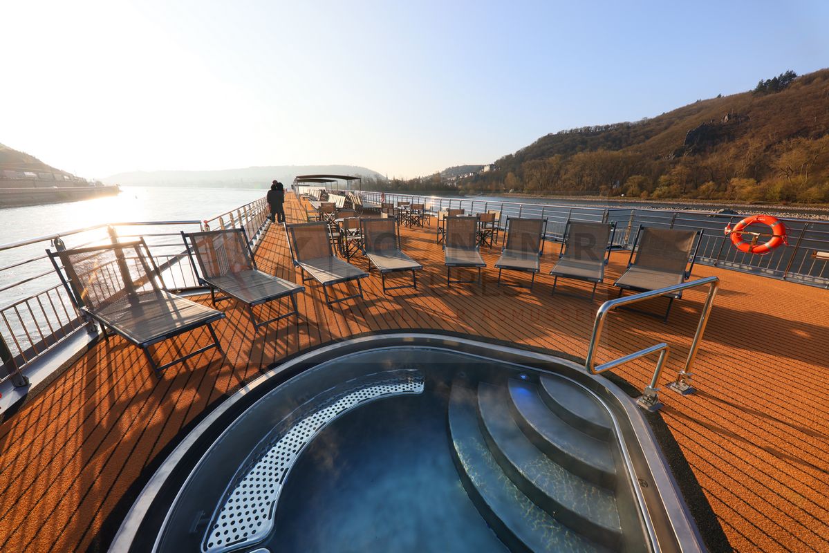 Das weitläufige Sonnendeck ist mit geschmackvollem Kunstrasen in Holzoptik sowie einer Vielzahl an Sonnenliegen und Stühlen ausgestattet. Wie auf der Amina ist der vordere, um ein halbes Deck tiefer liegende, Loungebereich nicht besonders groß. Das liegt an der beschriebenen Deckaufteilung. Die großen Sonnenschirme sind entsprechend auch nicht im vorderen Bereich, sondern hinter dem Fahrstand installiert, der wiederum recht weit vorne angeordnet ist. Bei niedrigen Brückenpassagen, bei denen das Hauptsonnendeck geschlossen werden muss, fällt der Bereich, der geöffnet bleiben kann, nicht besonders groß aus.