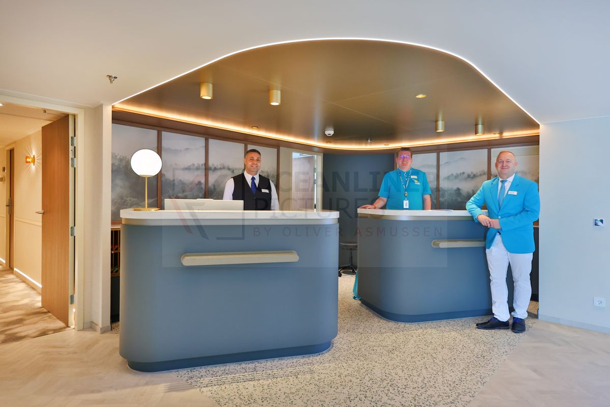 Der Flusskreuzfahrtschiff-Neubau MS Aurelia von Phoenix Reisen überzeugt gleich nach dem Durchschreiten der großen Glastüren. Das Foyer zeigt sich in dezentem, ansprechenden Farbdesign. Sofort ins Auge fällt die LED-Leinwand, die sich über alle drei Decks des Foyers erstreckt und dauerhaft einen Wald zeigt. Auf der Amina war es ein Wasserfall. Anders als bei der Amina wird die LED-Wand im unteren Bereich von einer Glasscheibe geschützt, was Schäden vermeiden soll. Die Anordnung der Rezeption und des Phoenix-Schalters ist identisch zur Amina. Zwei kleine Sitzecken, eine kleine Bord-Boutique und einen Wasserspender findet man ebenfalls im Bereich der Rezeption. Der Gesamteindruck ist durchweg positiv, insbesondere durch die moderne und ansprechende „Wald-Wand“.