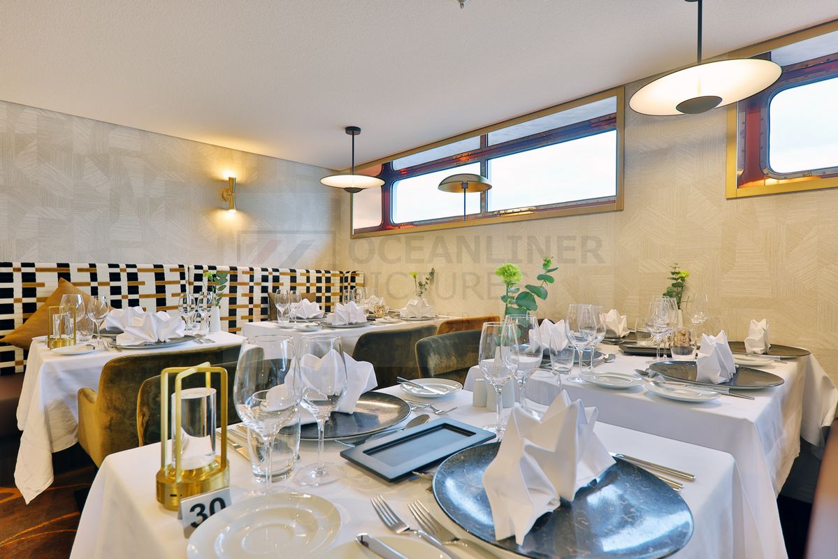 Der Zugang zum Restaurant erfolgt über das offene Haupttreppenhaus bzw. die beiden Fahrstühle, welcher die Kabinendecks miteinander verbinden.