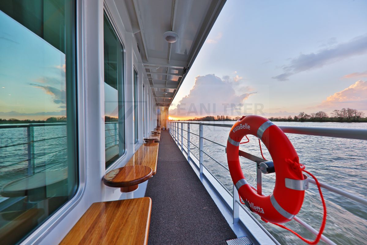 Raucher finden ihren Bereich außerhalb des Schiffes auf Höhe der Rezeption. Außerdem darf in Bereichen auf der vorderen Promenade geraucht werden. Die VistaBelle ist mit einer Promenade bzw. Galerie versehen, die sich über die Länge der ganzen Lounge erstreckt. Nur wenige Flusskreuzfahrtschiffe bieten eine solche Promenade, die sich gerade in den warmen Monaten großer Beliebtheit erfreuen dürfte. Ein kleiner Nachteil ist die teilweise eingeschränkte Sicht aus den Innenbereichen heraus, wenn Gäste auf den Bänken der Promenade sitzen. Ein weiterer Nachteil ergibt sich daraus, dass der Innenbereich der Lounge entsprechend kleiner ausfällt.