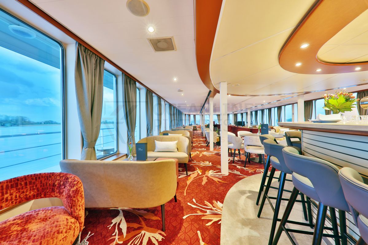 Die Lounge ist im Vergleich zu vielen anderen Flusskreuzfahrtschiffen etwas kleiner, da der Platz für die Außengalerie im Innenbereich sozusagen „verloren“ geht. Optisch ist die Lounge sehr ansprechend und zeitgemäß designt. Es gibt sowohl kleine als auch große Tische. Letztere eignen sich besonders für große Gruppen die gemeinsam auf Reisen gehen. Im vorderen Loungebereich befindet sich eine Tanzfläche sowie der Platz für einen DJ oder Alleinunterhalter.