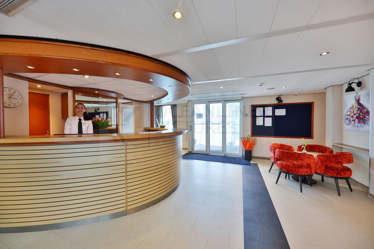 Die Gäste betreten die VistaBelle durch einen großzügigen und hellen Eingangsbereich. Ein Fahrstuhl verbindet das Mittel- und das Oberdeck miteinander. Das Sonnendeck ist nur über eine Treppe erreichbar. Die Treppe ist etwas anders angeordnet, als man es von vielen anderen Flusskreuzfahrtschiffen kennt. Es gibt von der Rezeption keine direkte Treppe hinunter auf das Haupt- und Mitteldeck. Das eigentliche Treppenhaus ist mehr oder weniger neben dem Rezeptionsbereich angeordnet. Wer also in die Kabinen des Haupt- oder Mitteldecks möchte, muss entweder zunächst über einige Stufen hinauf auf das Oberdeck, um von dort aus über das Treppenhaus zu den anderen Decks zu gelangen, oder aber man nutzt den Fahrstuhl, der die Decks miteinander verbindet. Was zunächst etwas irritierend erscheint, hat sich schon nach kurzer Zeit im Gedächtnis eingeprägt.