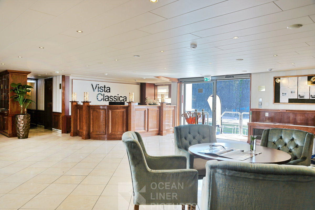 Die Gäste betreten die VistaClassica durch einen recht großzügigen, offenen und ansprechend gestalteten Eingangsbereich mit hellem Granitboden. Ein Aufzug verbindet das Oberdeck mit dem Restaurant. Obwohl sich die Hauptdeckkabinen und der Wellnessbereich auf demselben Deck befinden wie das Restaurant, sind sie nicht mit dem Fahrstuhl zu erreichen. Das Sonnendeck ist über zwei Außentreppen neben dem Foyer zugänglich. Man findet sich überall schnell und problemlos zurecht. Unmittelbar im Foyer gibt es mehrere gemütliche Sitzgelegenheiten.