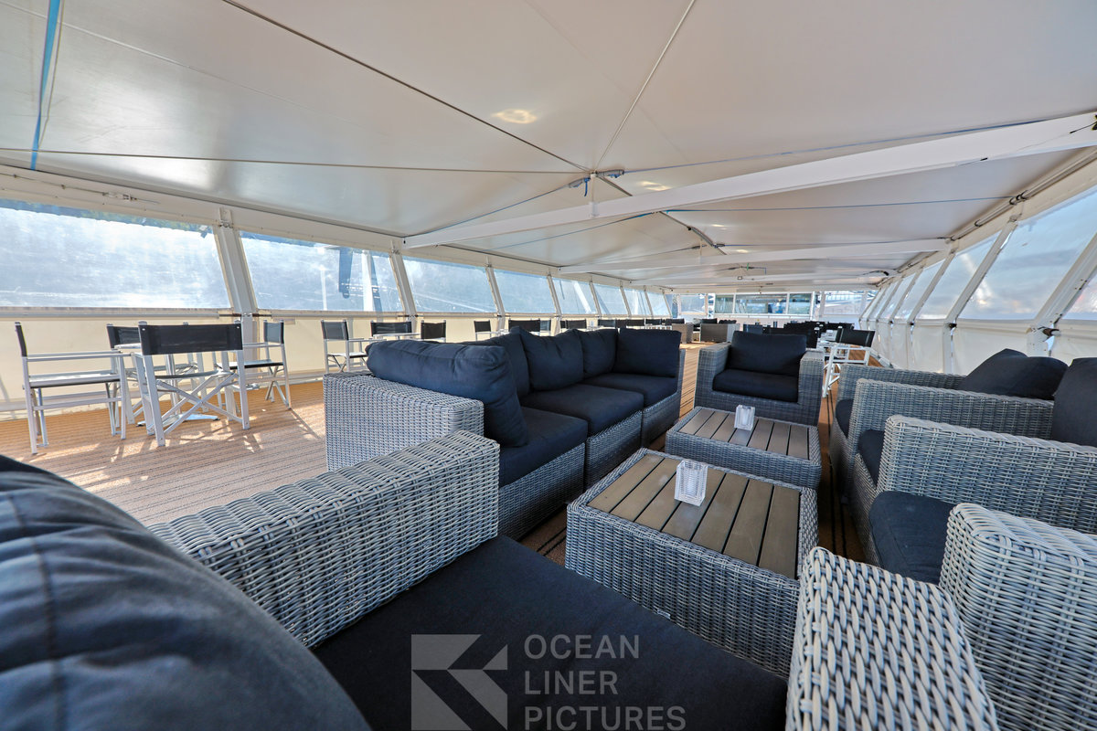 Das Sonnendeck erstreckt sich über einen großen Teil der verfügbaren Schiffslänge. Es unterteilt sich in einen offenen Bereich mit Sitzgelegenheiten und einen überdachten, loungeähnlichen Abschnitt mit weiteren Sitzmöglichkeiten. Besonders der überdachte Bereich erinnert an einen gemütlichen Wintergarten, der sowohl an kühlen, verregneten Tagen als auch als Sonnenschutz im Sommer genutzt werden kann.