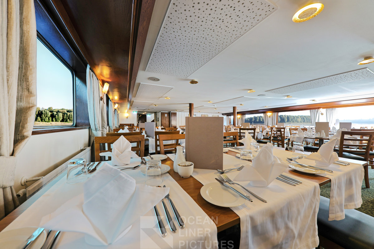 Das Restaurant befindet sich auf dem Hauptdeck unterhalb der Panoramalounge. Das Frühstück wird in Buffetform angeboten, während Mittag- und Abendessen à la carte serviert werden. Das Verpflegungskonzept umfasst Vollpension mit reichhaltigem Frühstücksbuffet sowie mehrgängigen Mittags- und Abendmenüs inklusive Tisch- und Bargetränken.