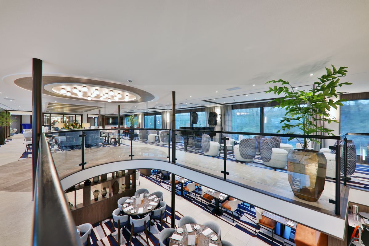 Wie auch auf der VIVA TWO ist die Aufteilung der Decks der neuen VIVA ENJOY sehr pfiffig und weicht von jener der älteren Schiffe deutlich ab. Das Foyer verbindet über zwei seitliche Treppen alle öffentlichen Decks miteinander. Auch das Sonnendeck ist vom Diamant-Deck aus zu erreichen. Ein Fahrstuhl verbindet ebenfalls die drei Kabinendecks. Im Vergleich zu den meisten anderen Schiffen der Scylla- und auch der VIVA-Flotte fällt das Schiff auf Höhe des Foyers nicht um ein halbes Deck ab, was zur Folge hat, dass von der Lobby aus, ein direkter Zugang in das Riverside Restaurant besteht. Das Riverside Restaurant ist das Hauptrestaurant der VIVA ENJOY, in dem eine internationale Gourmet-Küche und regionale Gerichte überzeugen. Zum Mittag- und Abendessen werden mehrgängige Menüs angeboten. Der integrierte Buffetbereich wird z.B. für das reichhaltige Frühstücksbuffet oder eine Salatstation genutzt. Zahlreiche Mitarbeiter des Küchen- und Restaurantteams sorgen täglich für das leibliche Wohl der Reisegäste an Bord und zaubern köstliche Mahlzeiten von früh bis spät.
