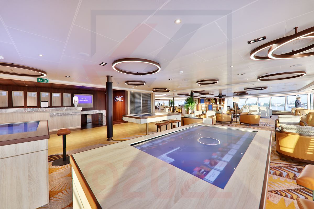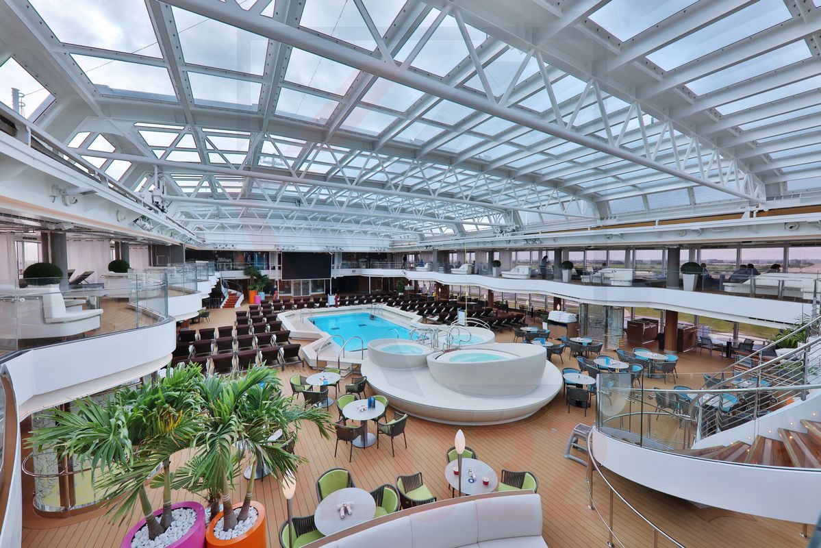 Deutlich interessanter ist da der Bereich um den Lido Pool herum. Dieser punktet zwar nicht mit seiner Größe, aber die Gestaltung des gesamten Areals ist wirklich sehr gut gelungen. Der Lido Pool wird von einem auffahrbaren Glasdach (Magrodome) überspannt. Die Sonnenliegen sind hochwertig, drei Whirlpools (1 Großer / 2 Kleine) laden zum Entspannen ein und auf einer mittelgroßen Videoleinwand können Spielfilme oder auch Videos zu Landausflügen usw. angeschaut werden. In einem sehr unaufdringlichen, ja, fast schon kühlen Design, zeigen sich die Bereiche auf dem darüberliegenden Panorama Deck. Hier findet man kleine Logen mit bequemen Loungemöbeln. Die Gestaltung ist modern, wirkt insgesamt aber etwas kühl.