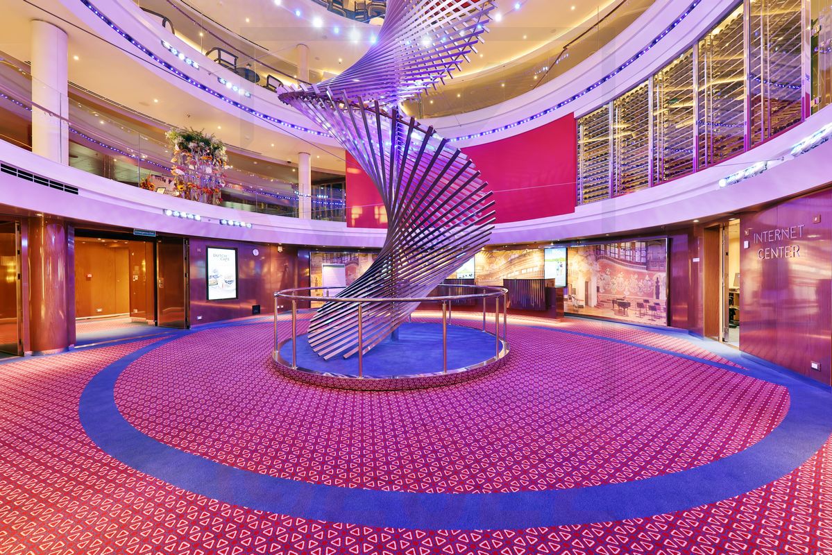 Wenn man über die Decks der Rotterdam läuft, stößt man immer wieder auf das auffällige und modern gestaltete Atrium des Schiffes. Blickfang sind eine große, spiralförmige und ineinander verschlungene Metallskulptur, sowie ein künstlerisches Blumengesteck, bestehend aus echten Blumen. Man muss kein Floristikprofi sein, um zu erkennen, dass es sich hier um sehr aufwendig gestaltete Blumendekorationen handelt.