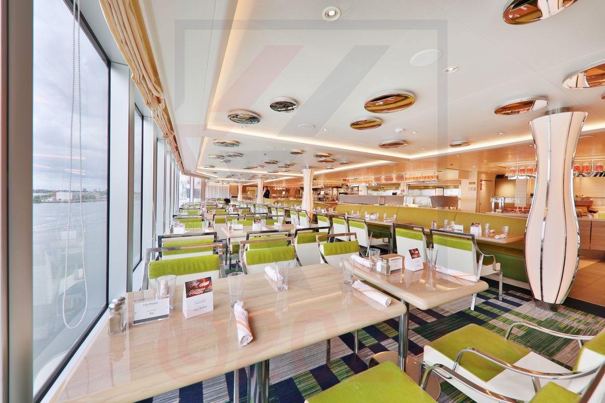 Dem überdachten Lido Pool schließt sich der große Buffetbereich Lido Market an. Der Lido Market ist im Grunde ein moderner Marktplatz, der in verschiedene Themenbereiche unterteilt ist. Die Gäste können sich hier an den Buffetstationen bedienen oder sich die Speisen nach der Auswahl der Zutaten auch frisch zubereiten lassen. Die Angebotspalette umfasst zum Beispiel folgende Varianten: