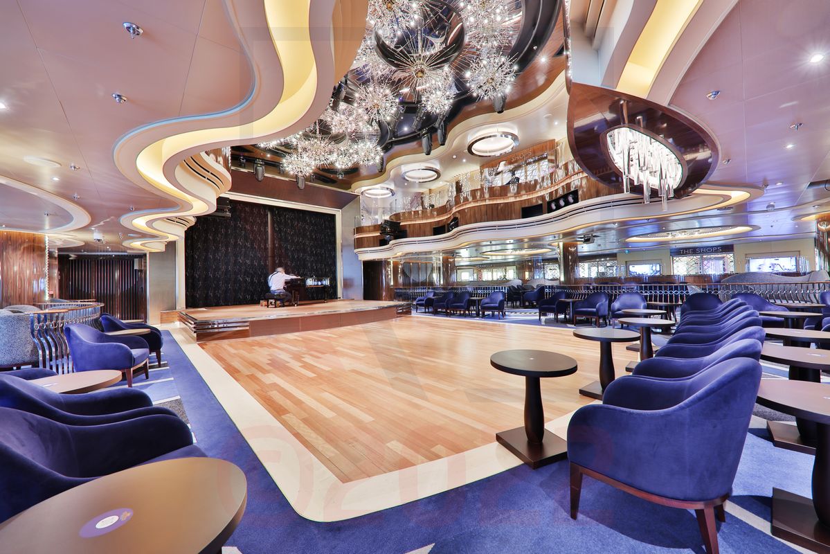 An der Steuerbordseite reihen sich diverse Shops, auf der Backbordseite liegt der schöne und zugleich sehr elegant gestaltete B.B. Kings´Blues Club. Mit der von den älteren Holland America Line-Schiffen bekannten Queen´s Lounge, hat der auf der Pinnacle-Class eingeführte B.B. Kings´Blues Club nur noch wenig Ähnlichkeit. Die Queen´s Lounge ist umgestaltet und in einen zweistöckigen Nachtclub verwandelt worden. Grazile Wellenformen, eine ansprechende Holzoptik, fließende Linien und ein ausgeklügeltes Beleuchtungskonzept setzen den B.B. King´s Blues Club perfekt in Szene. Tagsüber wird der Club für Präsentationen, Vorträge und andere Veranstaltungen genutzt. Abends sorgt eine grandiose, achtköpfige Band für ein hochkarätiges Unterhaltungsprogramm. Zu ganz später Stunde verwandelt sich der Raum erneut und wird zu einer Diskothek – aktuelle Musikstücke hallen über den schönen Parkettboden, moderne LED-Lichtanlagen liefern den passenden Farbmix dazu.